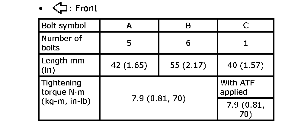 8) Install bolts (A), (B) and (C) in control valve with TCM. Tighten bolt (1), (2) and (3) temporarily to prevent dislocation. After that tighten them in order (1 -> 2 -> 3). Then tighten other bolts. Tighten control valve with TCM bolts to the specified torque.