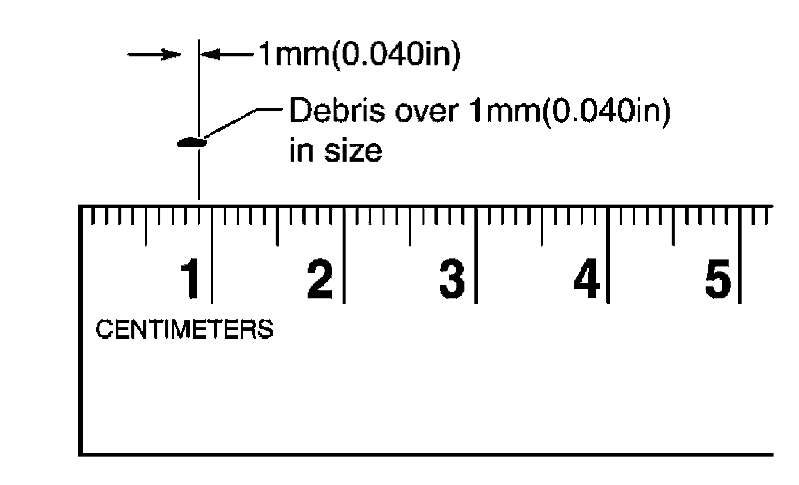 b) If one or more pieces of debris are found that are over 1mm (0.040 in) in size and/or peeled clutch facing material is found in the coffee filter, the fluid cooler is not serviceable. The A/T fluid cooler/radiator must be replaced and the inspection procedure is ended.