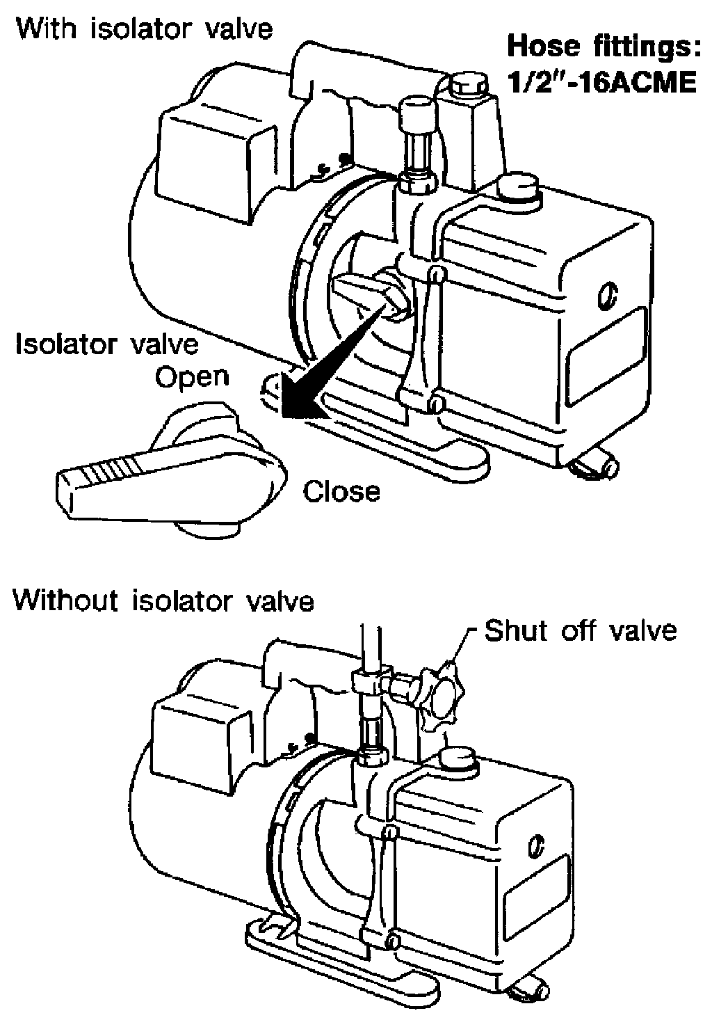 - Usually vacuum pumps have a manual isolator valve as part of the pump. Close this valve to isolate the service hose from the pump.