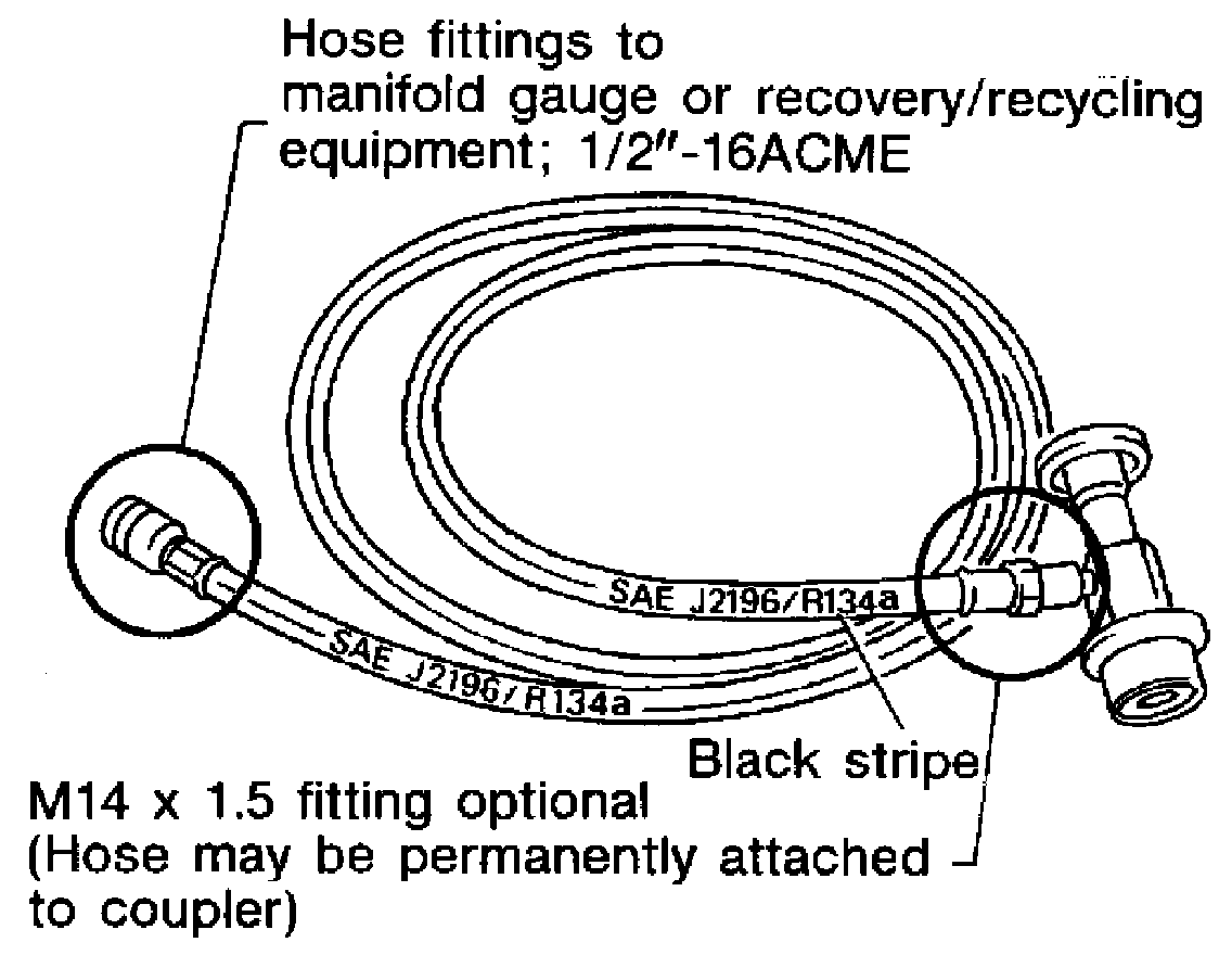 Be certain that the service hoses display the markings described (colored hose with black stripe). All hoses must include positive shut- off devices (either manual or automatic) near the end of the hoses opposite the manifold gauge.