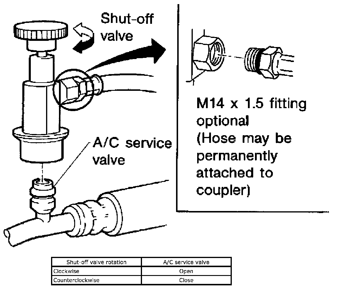 Never attempt to connect HFC-134a (R-134a) service couplers to a CFC-12 (R-12) A/C system. The HFC-134a (R-134a) couplers will not properly connect to the CFC-12 (R-12) system. If an improper connection is attempted, discharging and contamination may occur.