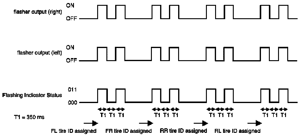 3. When the BCM finishes assigning each tire ID, the BCM flashes the hazard warning lamps and sends flashing indicator status by CAN according to the following time chart.