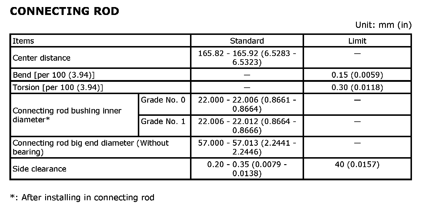 Connecting rod bolt: 19.6 N-m (2.0 kg-m, 14 ft-lb)
