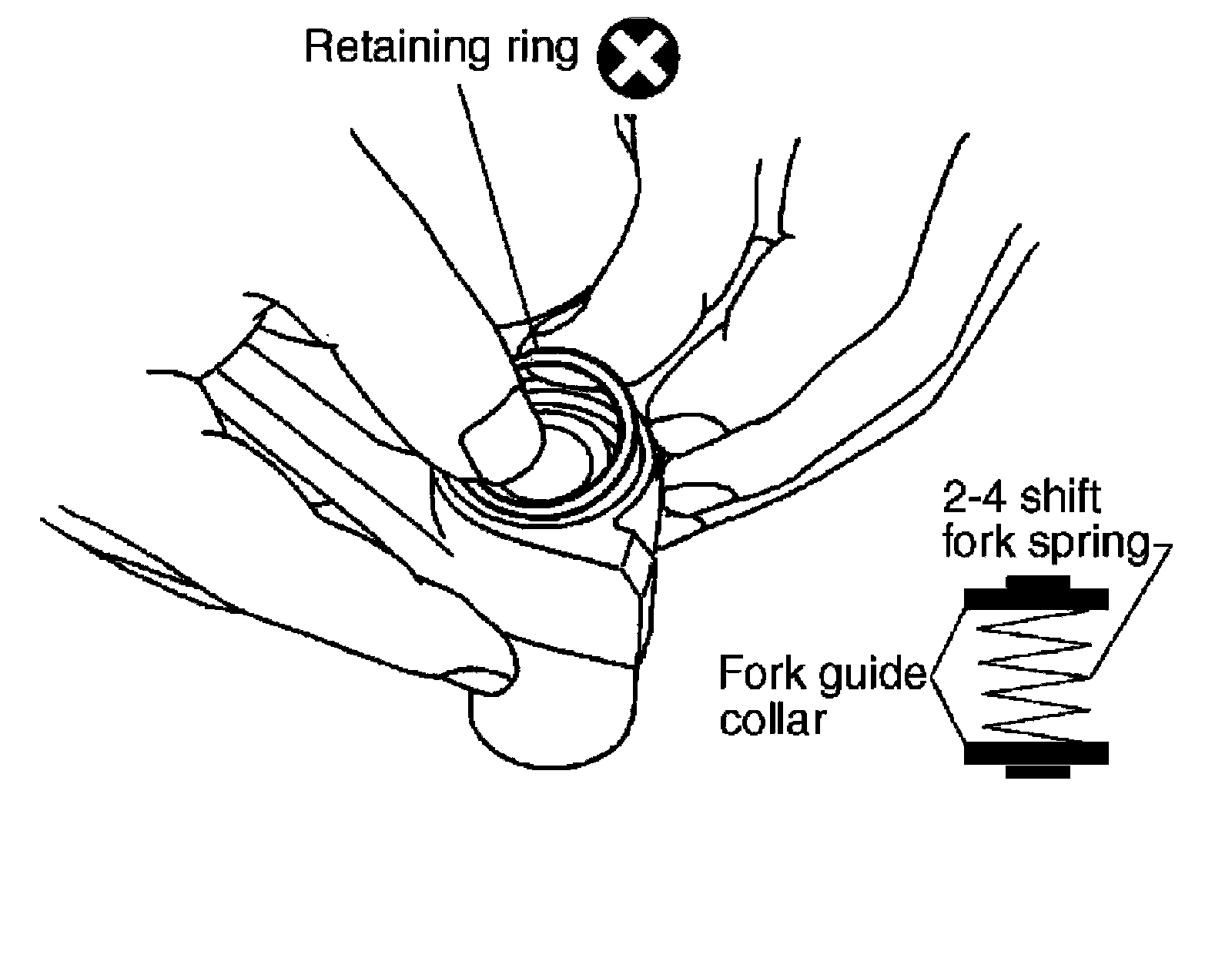 3) Install guide fork collar and 2-4 shift fork spring to the 2-4 shift fork, and then secure it with the new retaining ring.