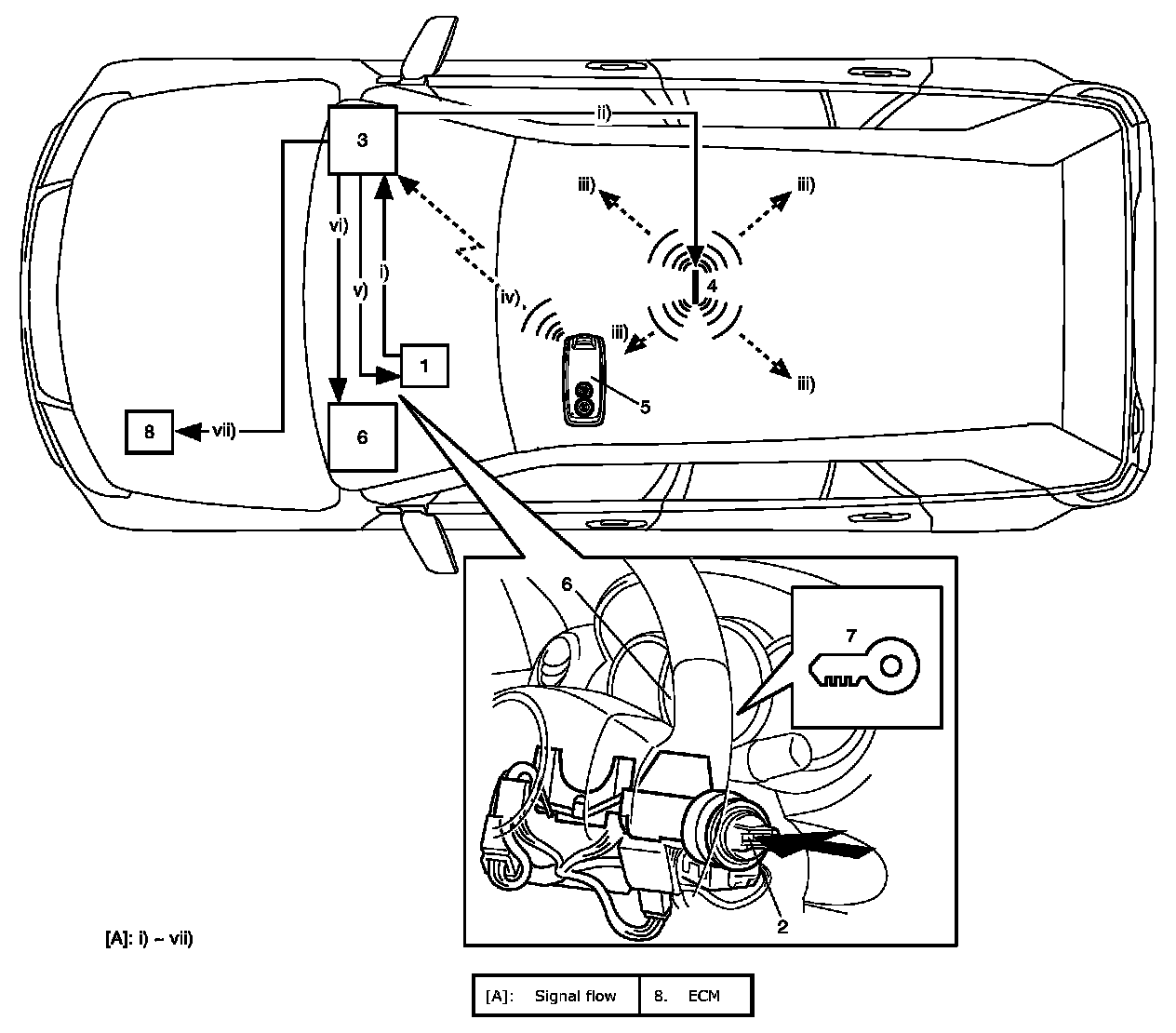 Description of Keyless Engine Start FunctionWhen the ignition knob switch (2) installed to the steering lock unit (1) is pushed, the keyless start control module (3) activates the center antenna (4) to send out the request signal in the vehicle compartment. When the remote controller (5) receives the request signal from the center antenna, it transmits the ID code to the keyless start control module. The keyless start control module compares the ID code sent by the remote controller with the ID code registered in the keyless start control module. When these ID codes match, the keyless start control module makes the key indicator light (7) in the combination meter (6) light in blue and unlocks the steering lock unit to enable the ignition knob switch to turn. When the ignition knob switch is turned to ON position in this state, ID codes of ECM and keyless start control module are compared through CAN communication (immobilizer function). When they match, turning the ignition knob switch to start position will start the engine.
