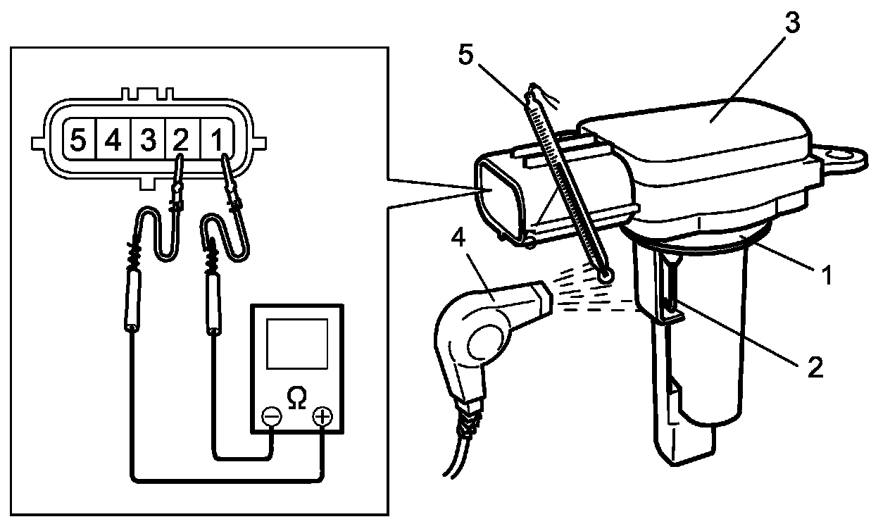 3. Measure resistance between sensor terminals "1" and "2" while blowing hot air to temperature sensing part (2) of MAF and IAT sensor (3) using hot air drier (4).