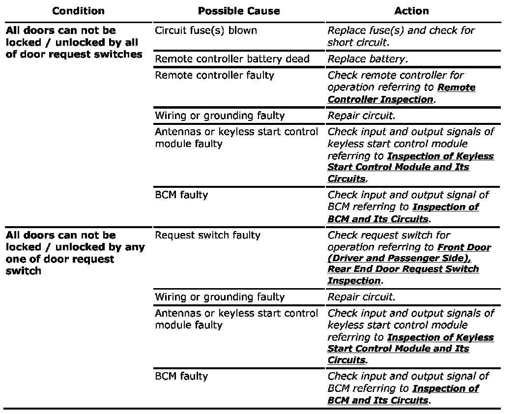 NOTE: Before performing trouble diagnosis procedure for door lock function of keyless start system, check that power door lock system operates properly referring to Power Door Lock System Operation Inspection. If power door lock system does not operate properly, go to Power Door Lock System Symptom Diagnosis. Symptom Related Diagnostic Procedures