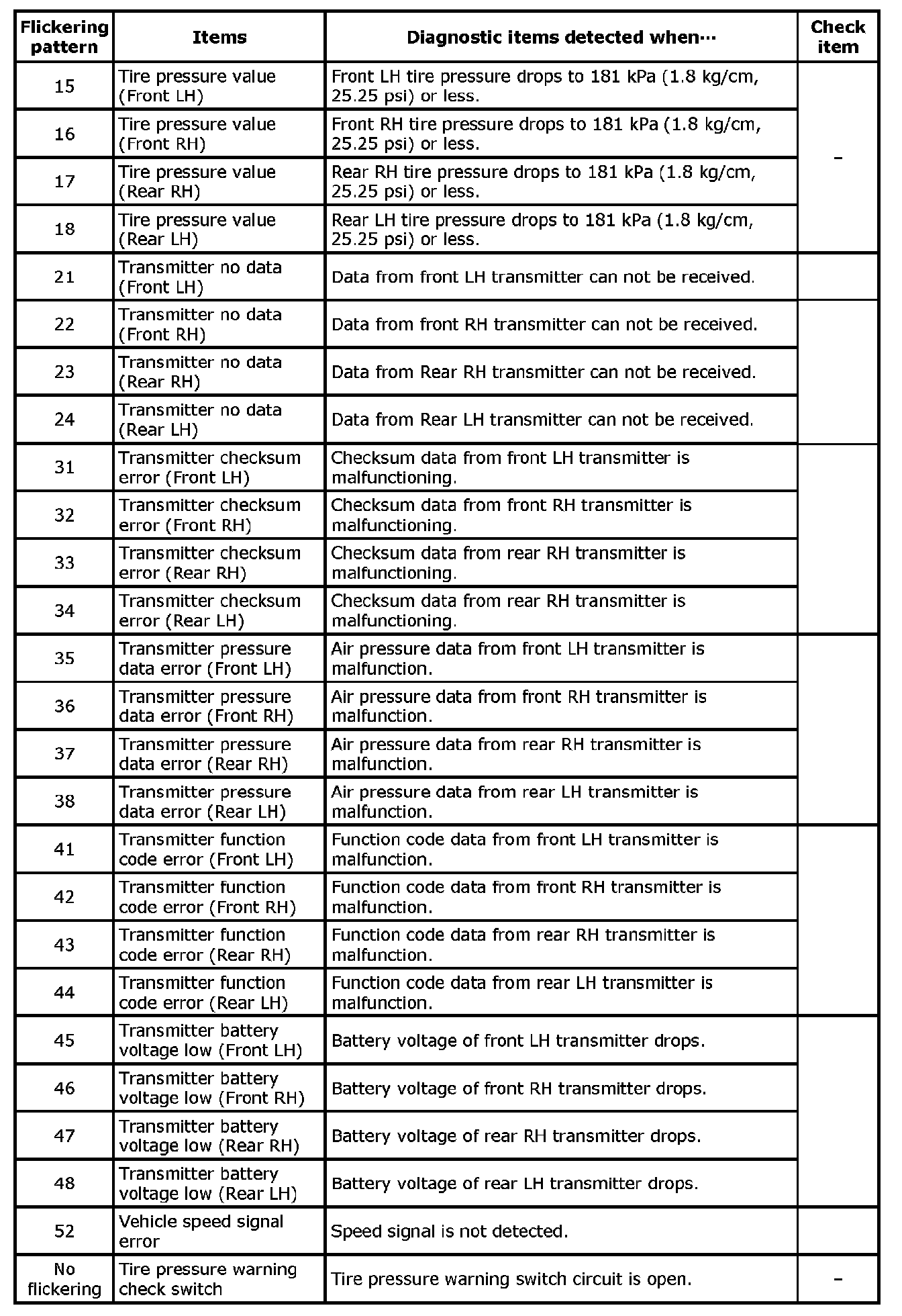 During driving, the TPMS receives the signal transmitted from the transmitter installed in each wheel, when the tire pressure becomes low. The control unit (BCM) of this system has pressure judgment and trouble diagnosis functions.