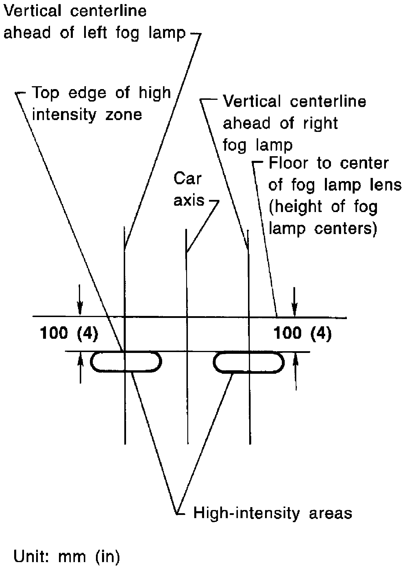 4. Adjust front fog lamps using adjustment screw so that the top edge of the high intensity zone is 100 mm (4 in) below the height of the fog lamp centers as shown.