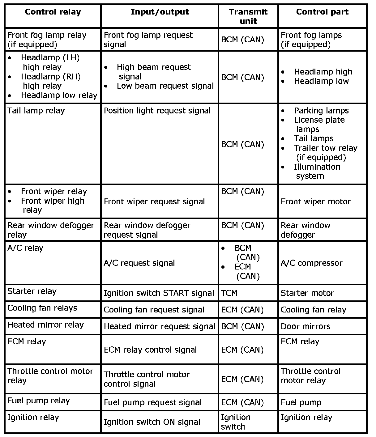 Relay Control System: System DescriptionIPDM E/R activates the internal control circuit to perform the relay ON-OFF control according to the input signals from various sensors and the request signals received from control units via CAN communication.