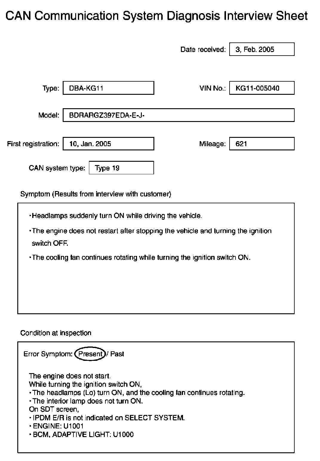 Fill out the symptom described by the customer, vehicle condition, and CAN system type on the interview sheet.