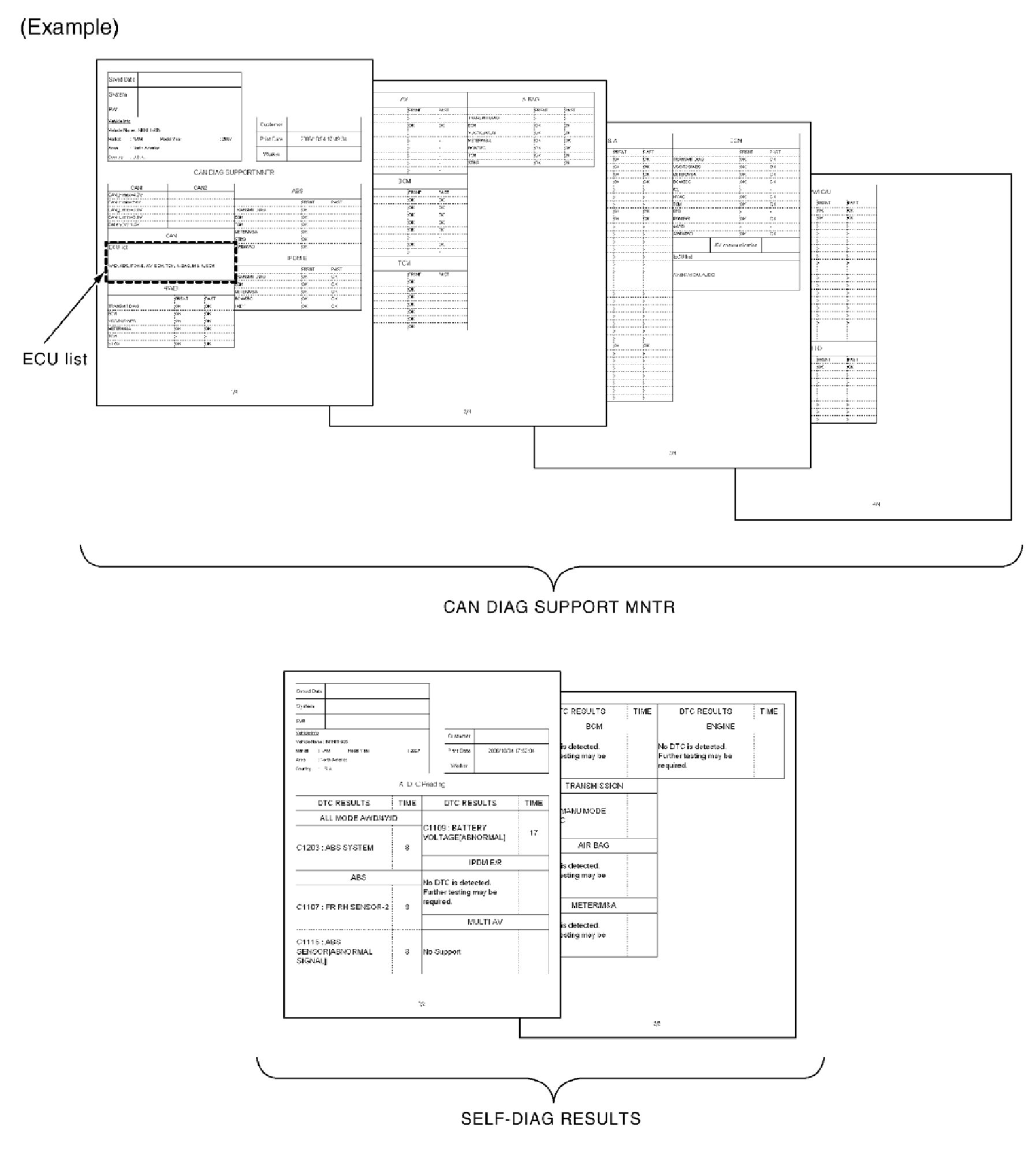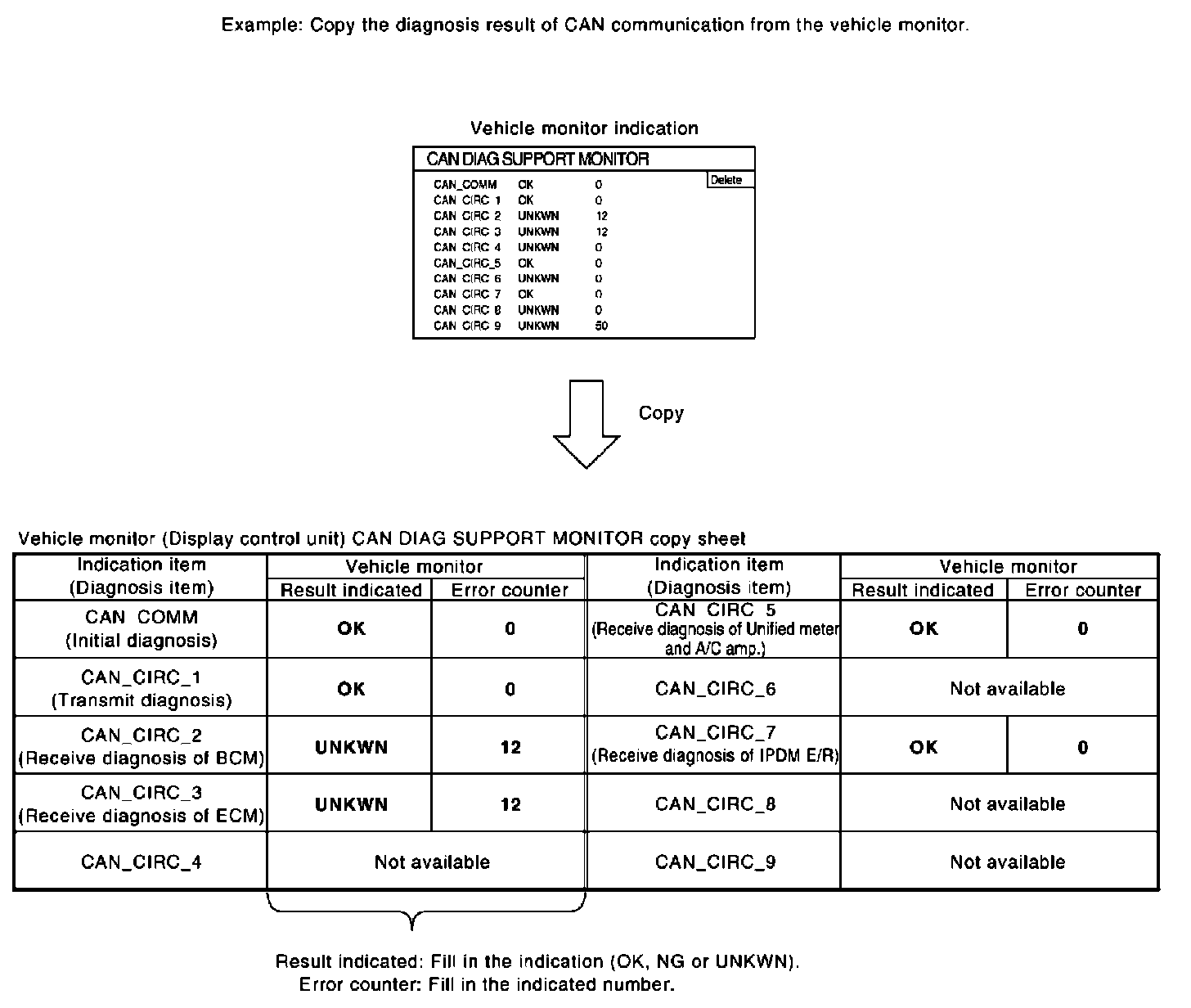 Display the trouble diagnosis result of CAN communication with the on-board diagnosis function on the vehicle monitor, etc. Copy them on the on-board diagnosis copy sheet.
