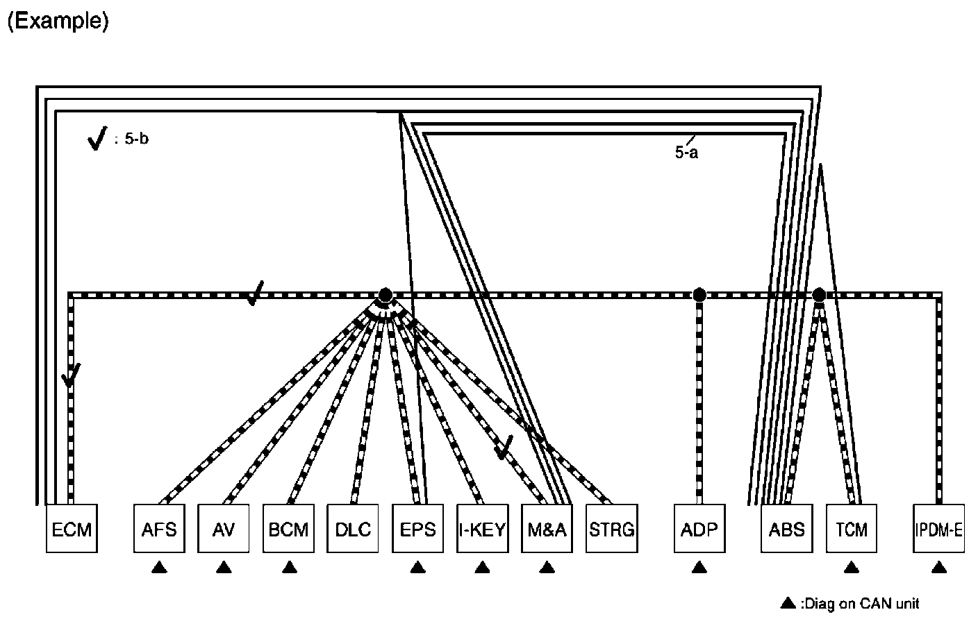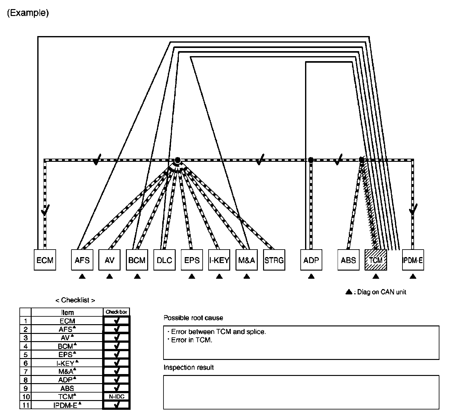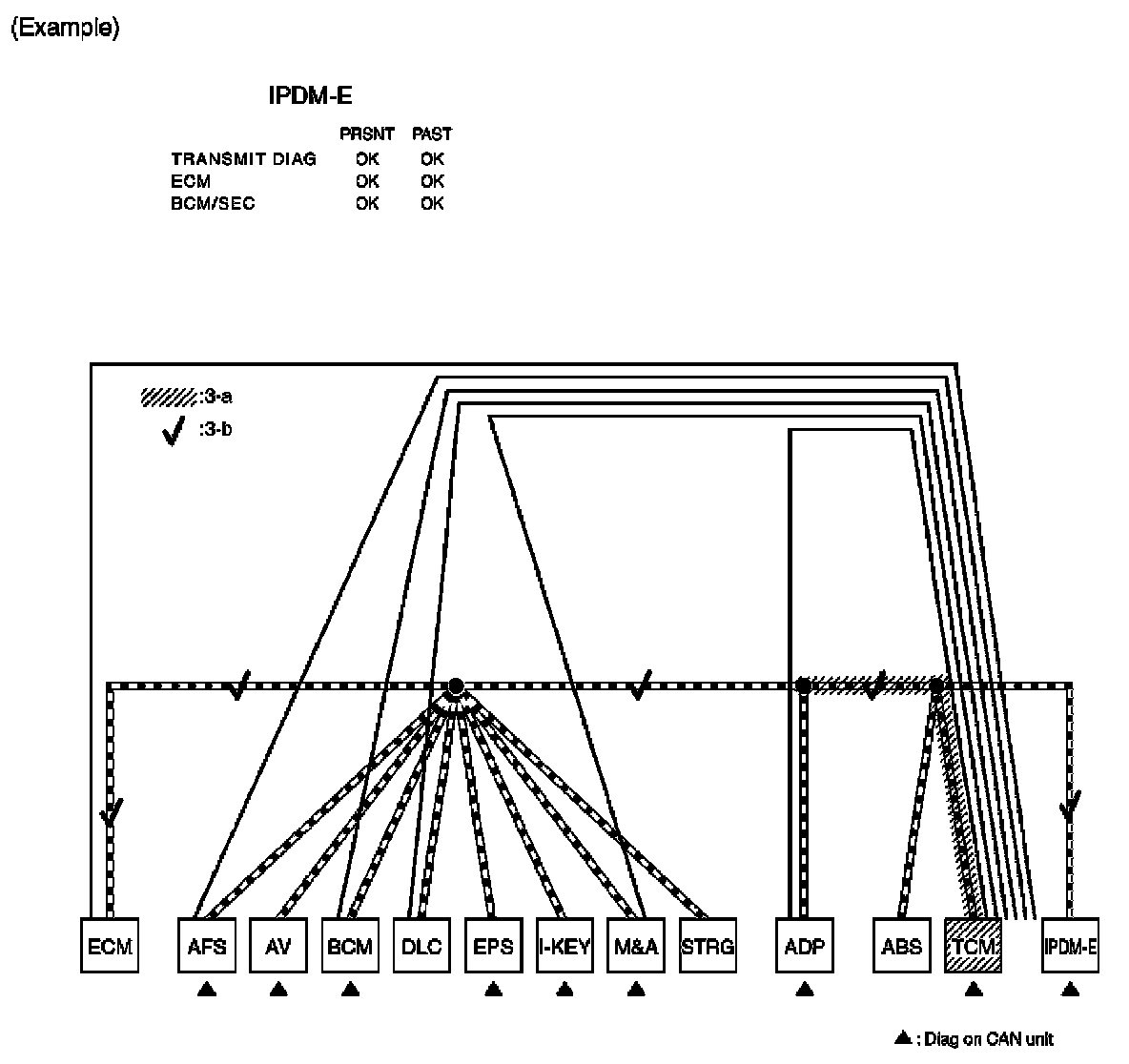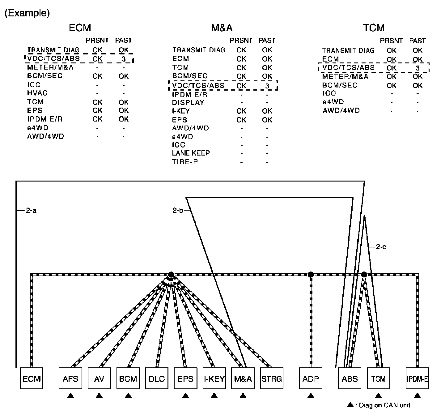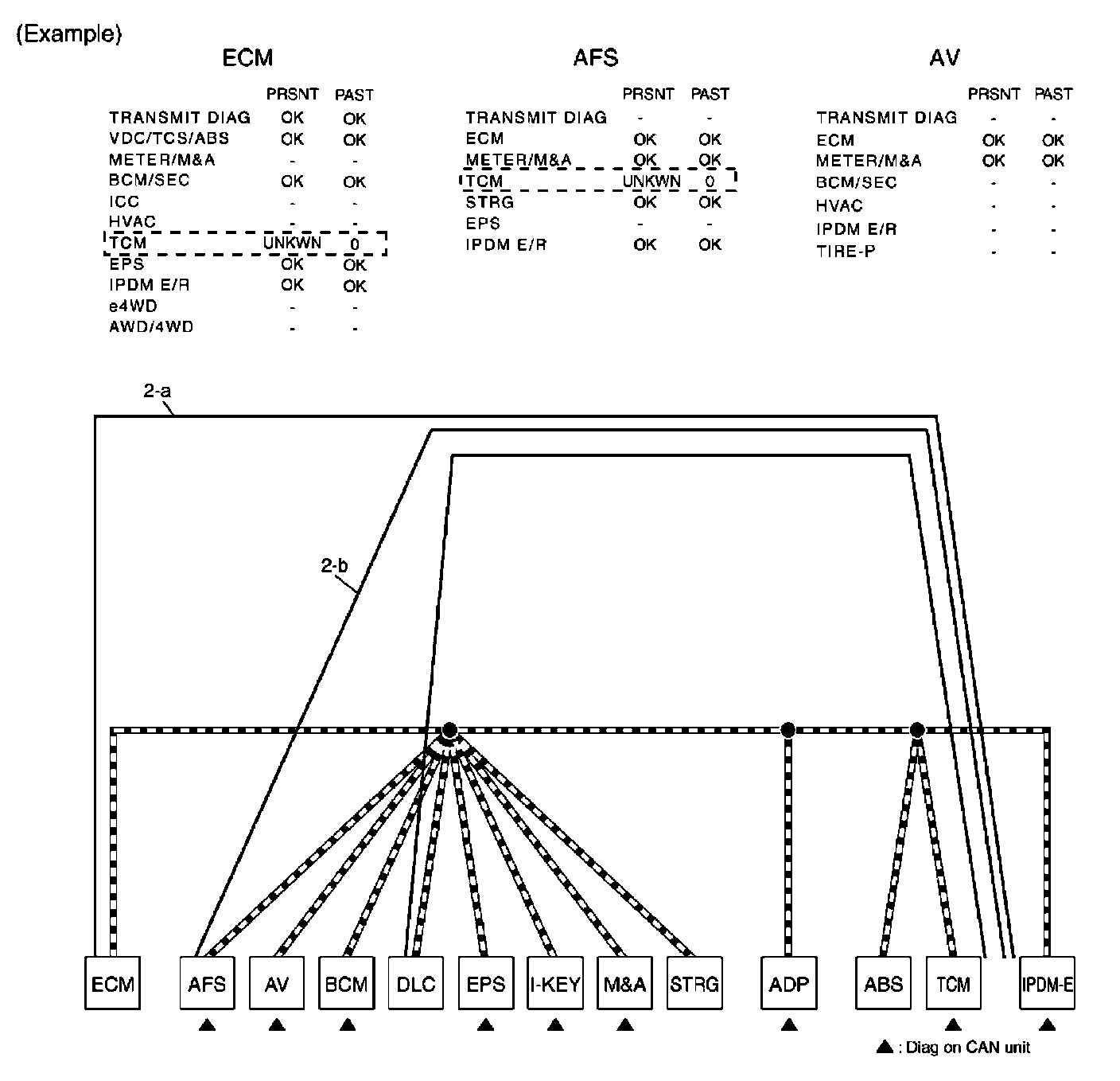 b. Reception item of "AFS": On "TCM", "UNKWN" is indicated. This means AFS cannot receive the signal from TCM. Draw a line to indicate an error between AFS and TCM (line 2-b in the figure below).