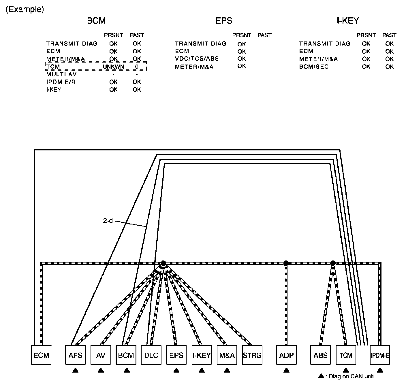 d. Reception item of "BCM": On "TCM", "UNKWN" is indicated. This means BCM cannot receive the signal from TCM. Draw a line to indicate an error between BCM and TCM (line 2-d in the figure below).