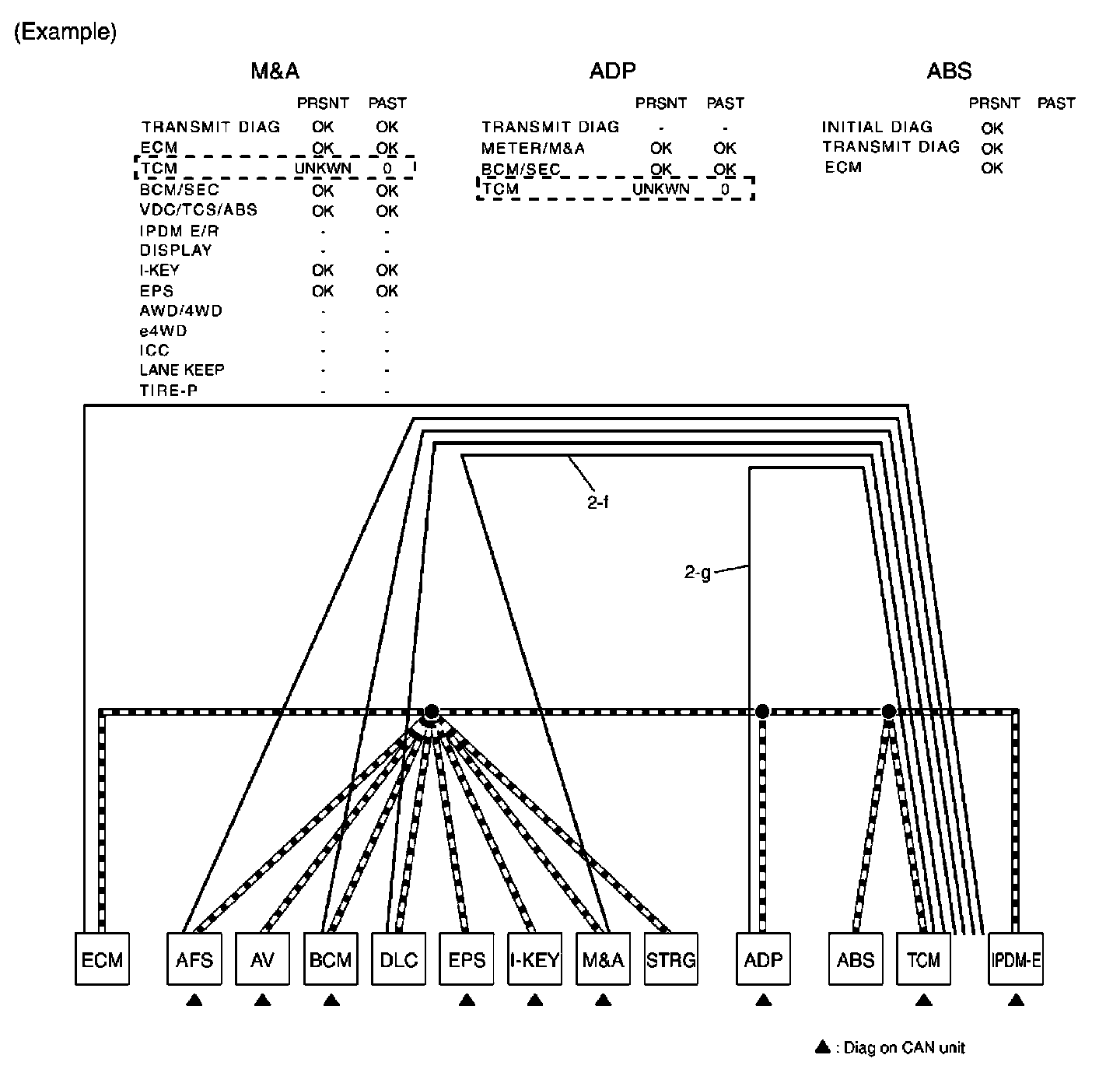 g. Reception item of "ADP": On "TCM", "UNKWN" is indicated. This means ADP cannot receive the signal from TCM. Draw a line to indicate an error between ADP and TCM (line 2-g in the figure below).