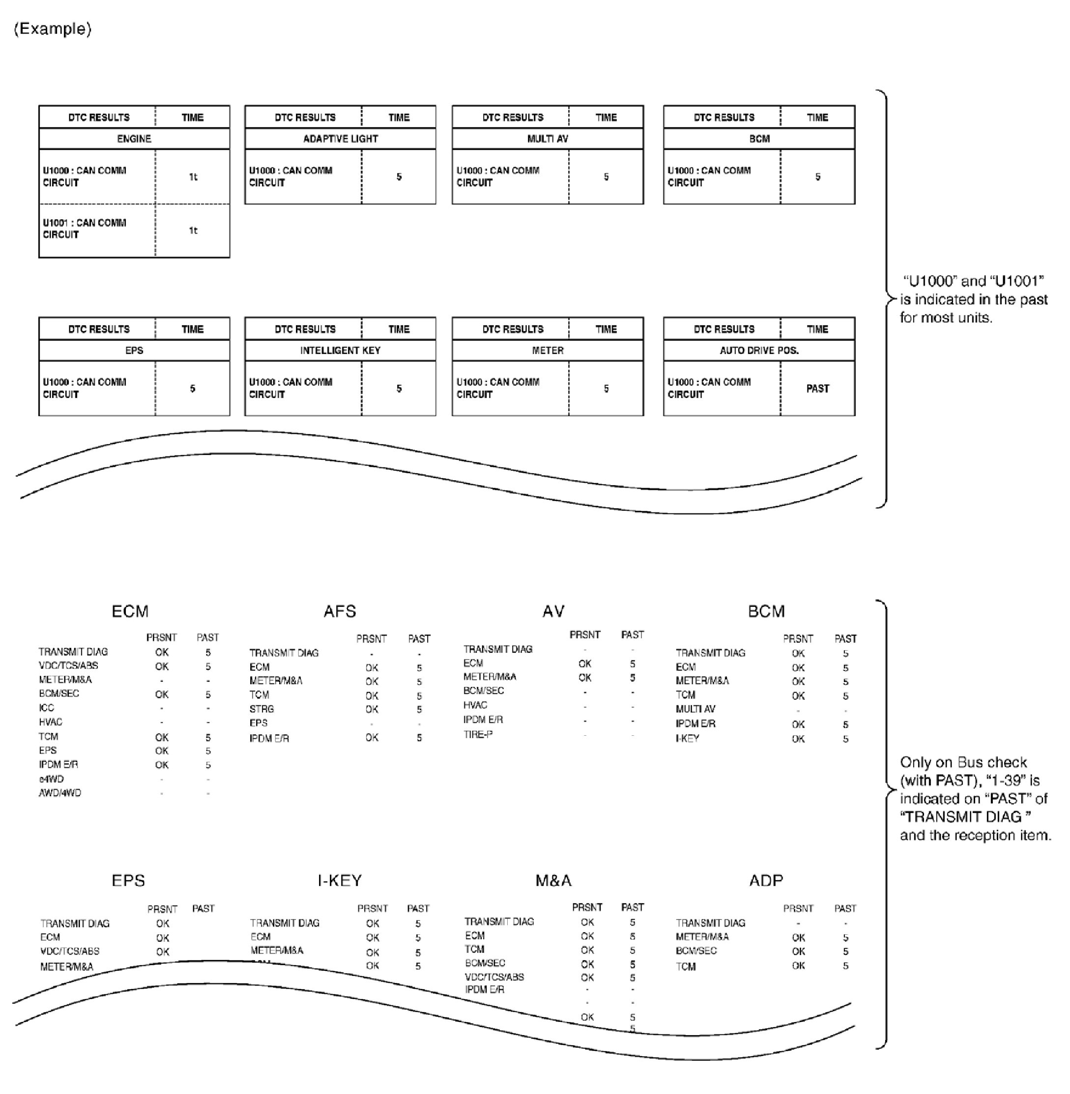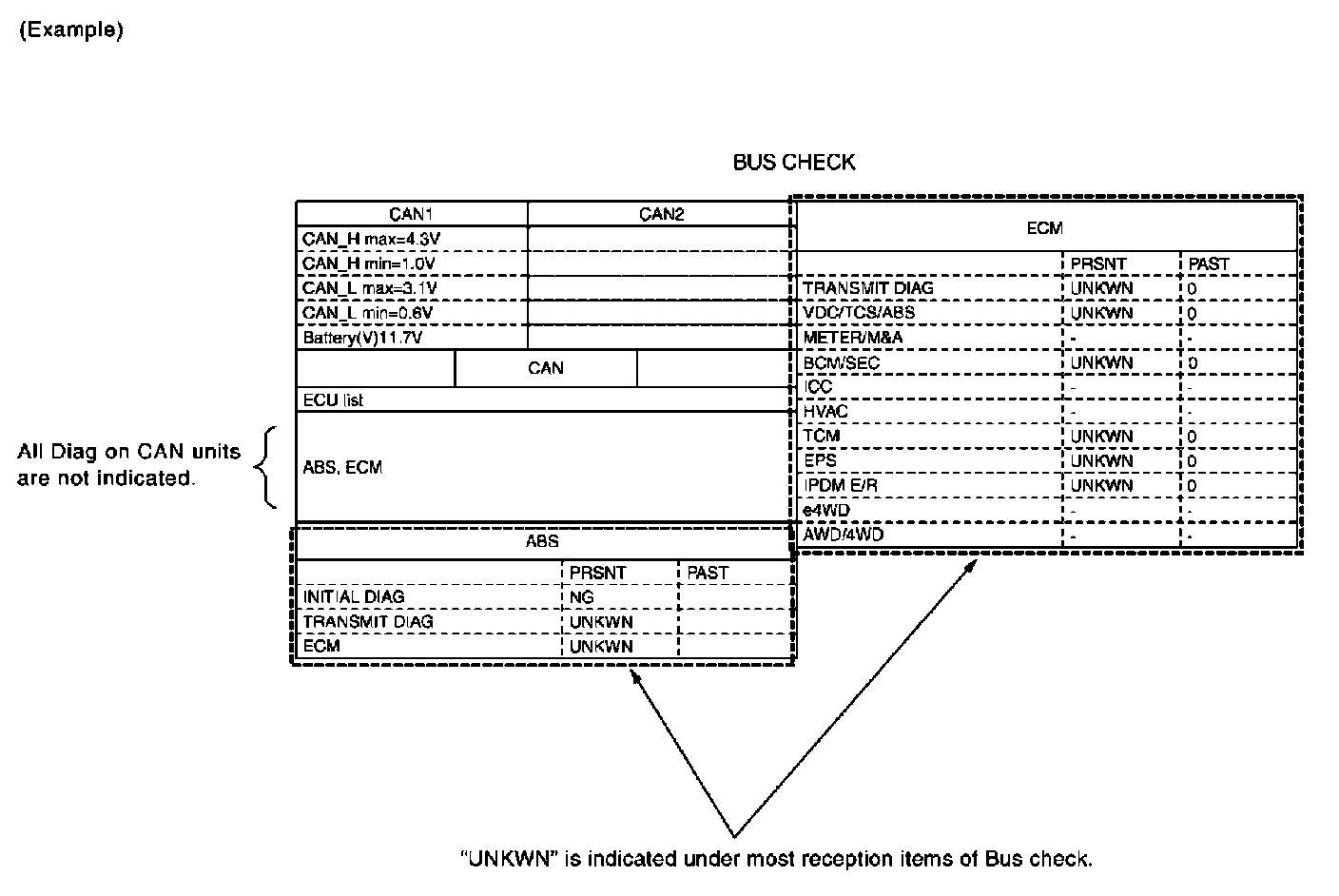 NOTE: On bus check (without PAST), "UNKWN" is indicated even though the item is not used in the trouble diagnosis. For the details of each item on bus check, refer to [Bus Check]. Bus Check