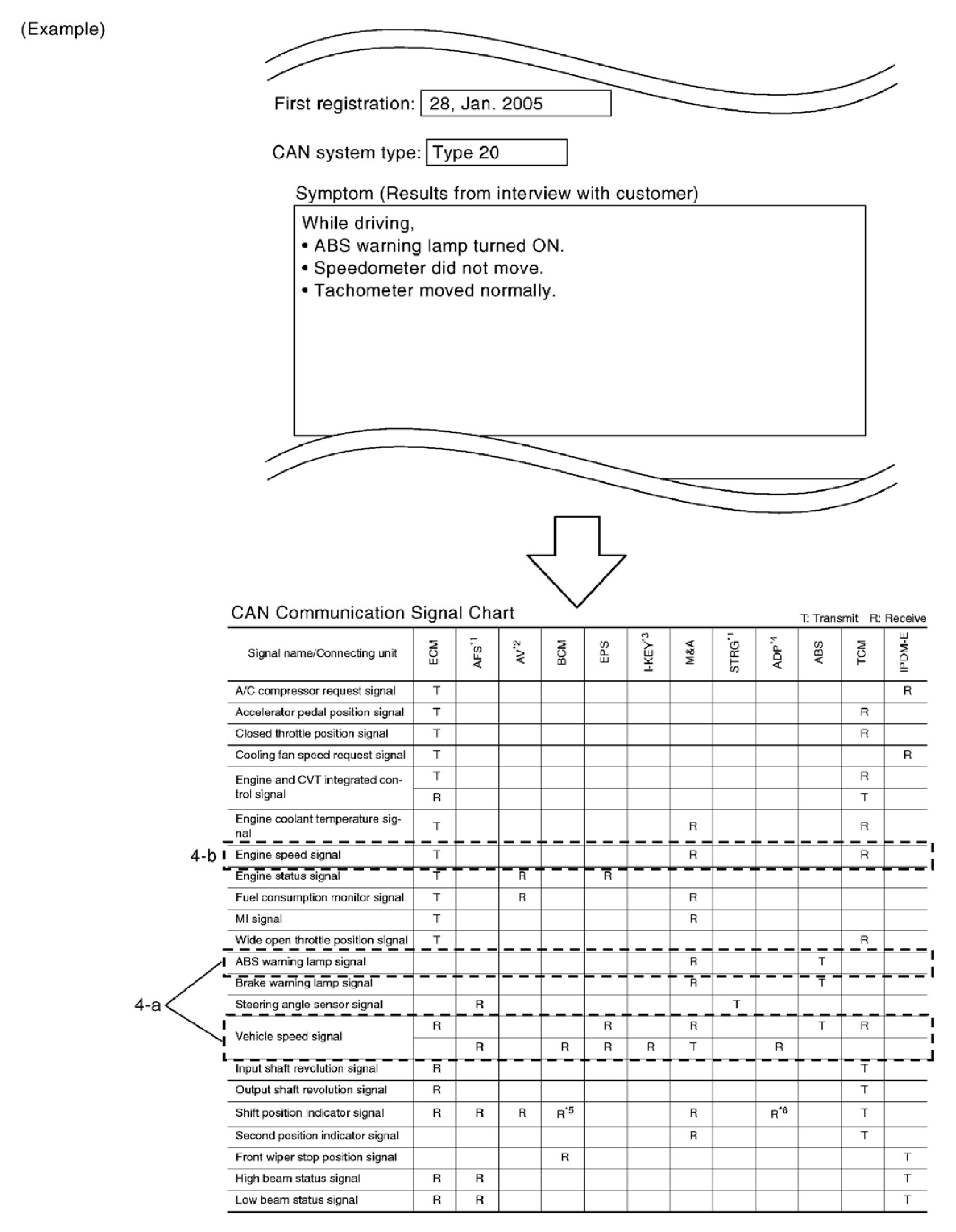 4. Search for the possible cause using CAN communication signal chart using information from the interview with the customer.