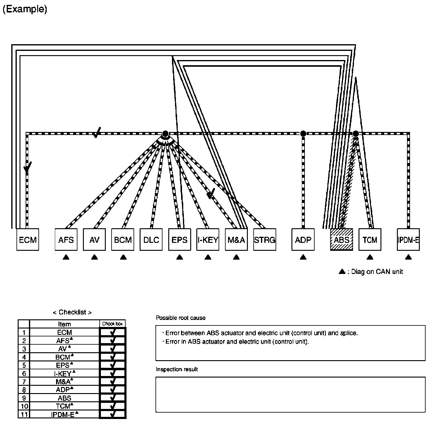 b. Reception item of "ABS": Assume that the unit could not receive the signal from ECM. Draw a line between ABS and ECM (line 3-b in the figure below).