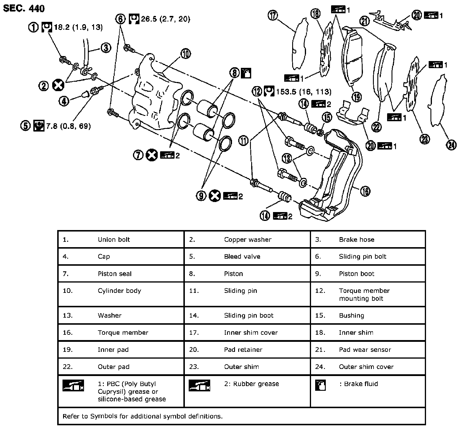- THE LARGE ILLUSTRATIONS are exploded views (see the following) and contain tightening torques, lubrication points, section number of the PARTS CATALOG (e.g. SEC. 440) and other information necessary to perform repairs.