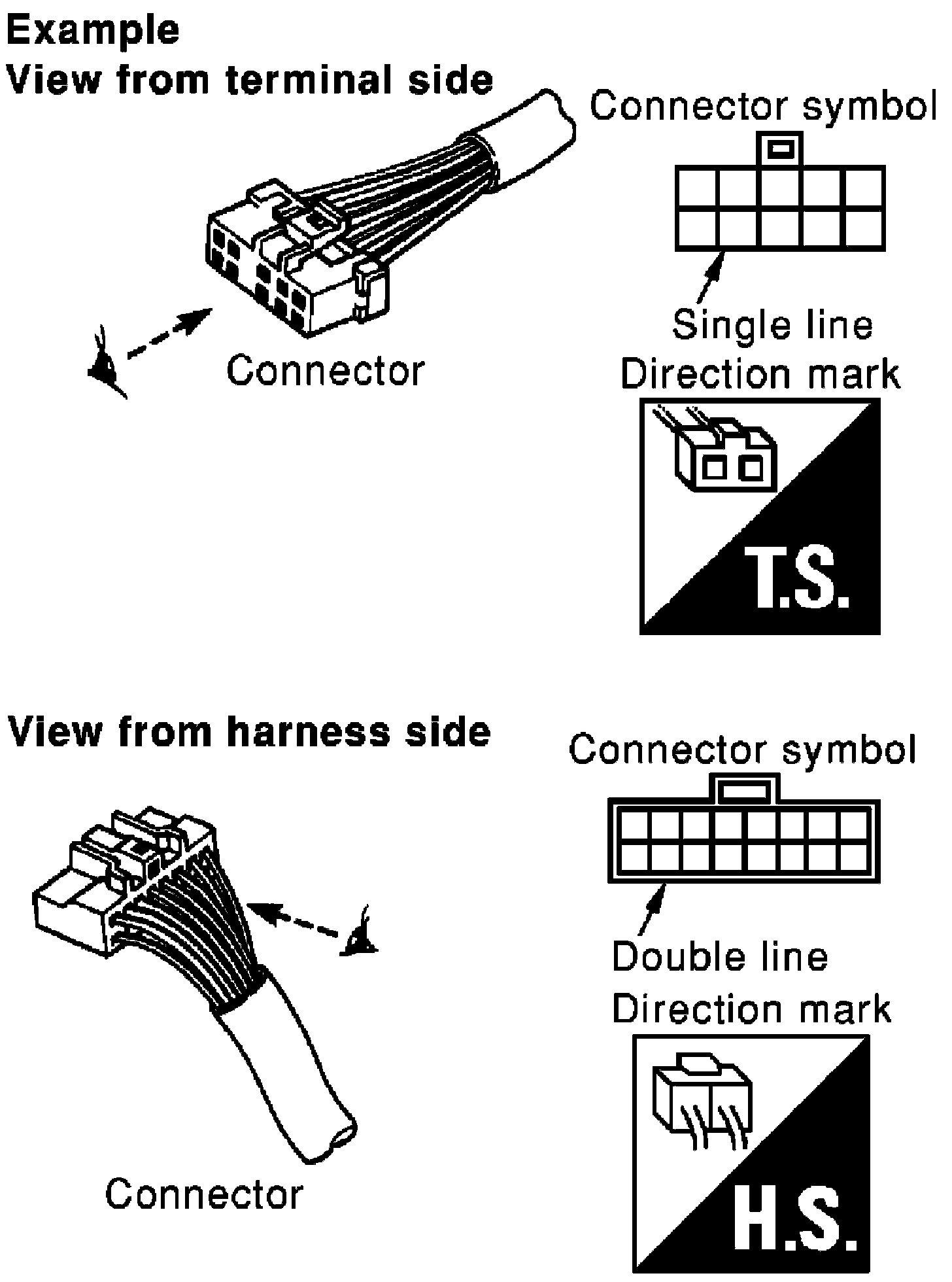 - Connector symbols shown from the harness side are enclosed by a double line and followed by the direction mark.