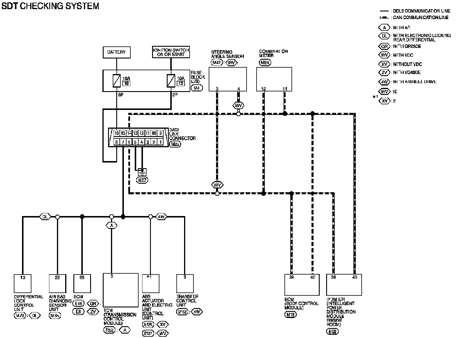 NOTE: The CAN and DDL2 circuits from DLC pins 6, 7 and 14 may be connected to more than one system. A short in any circuit connected to a control unit in one system may affect SDT access to other systems.