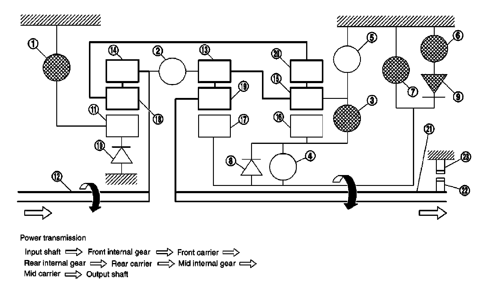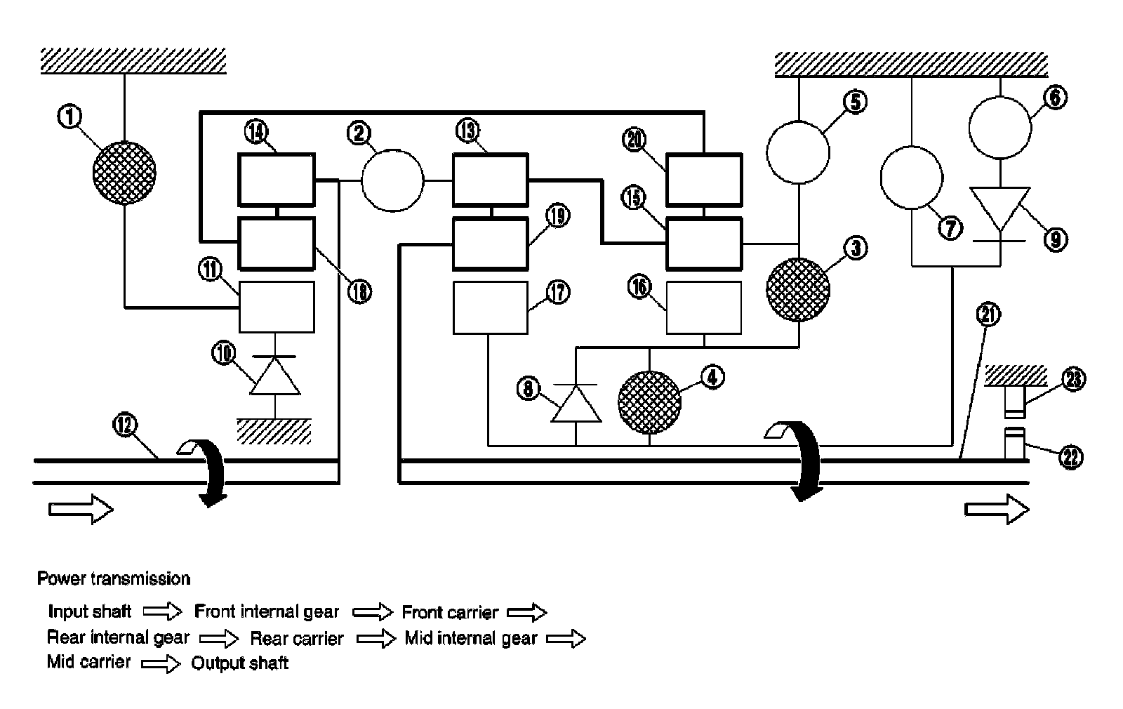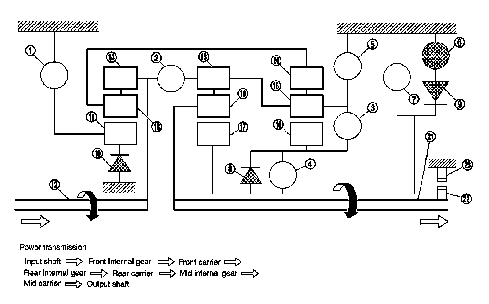^ The drive power is conveyed to the front internal gear, mid internal gear, and rear carrier and the three planetary gears rotate forward as one unit.