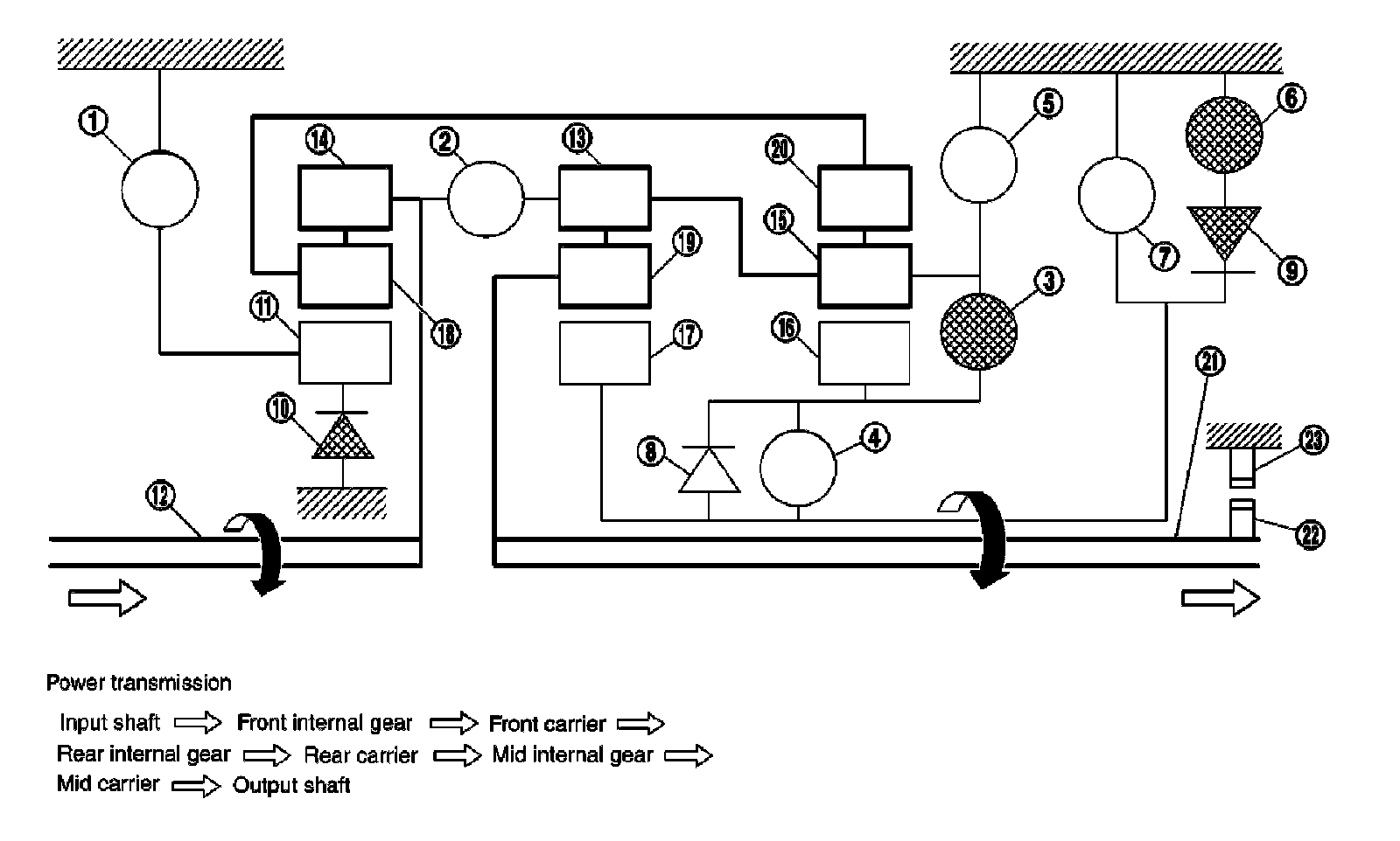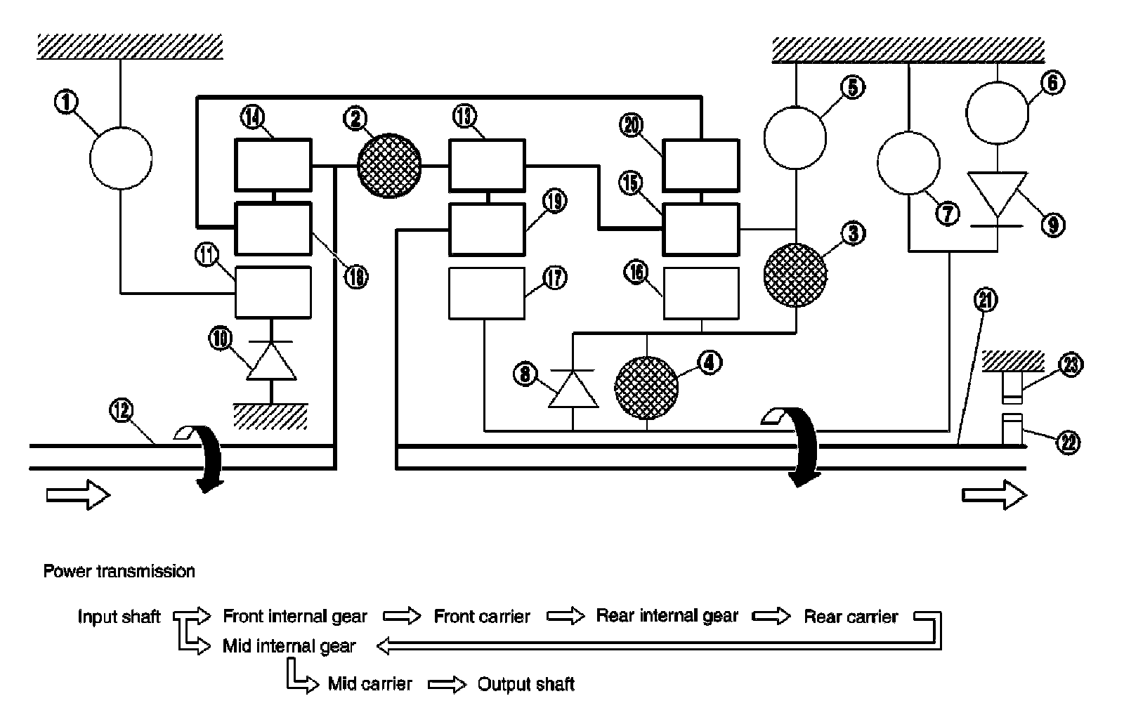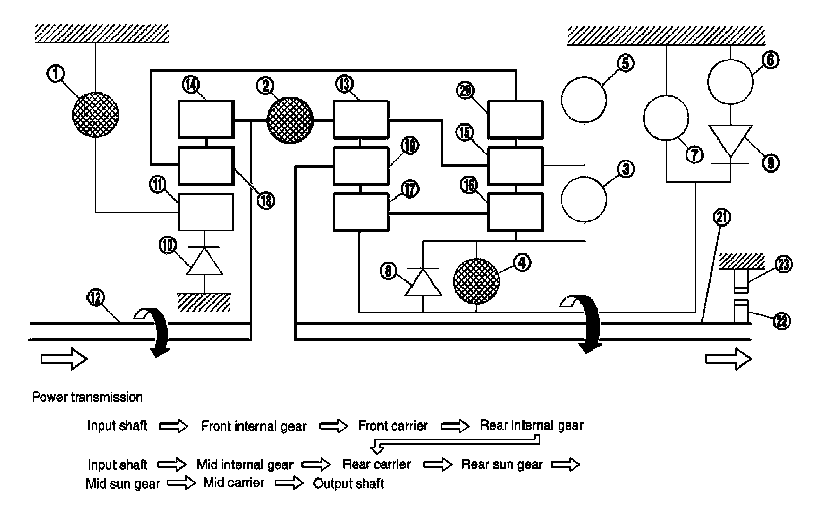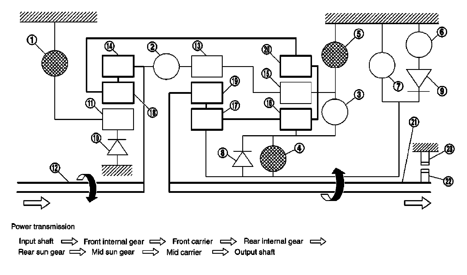 ^ The drive power is conveyed to the front internal gear, mid internal gear, and rear carrier and the three planetary gears rotate forward as one unit.