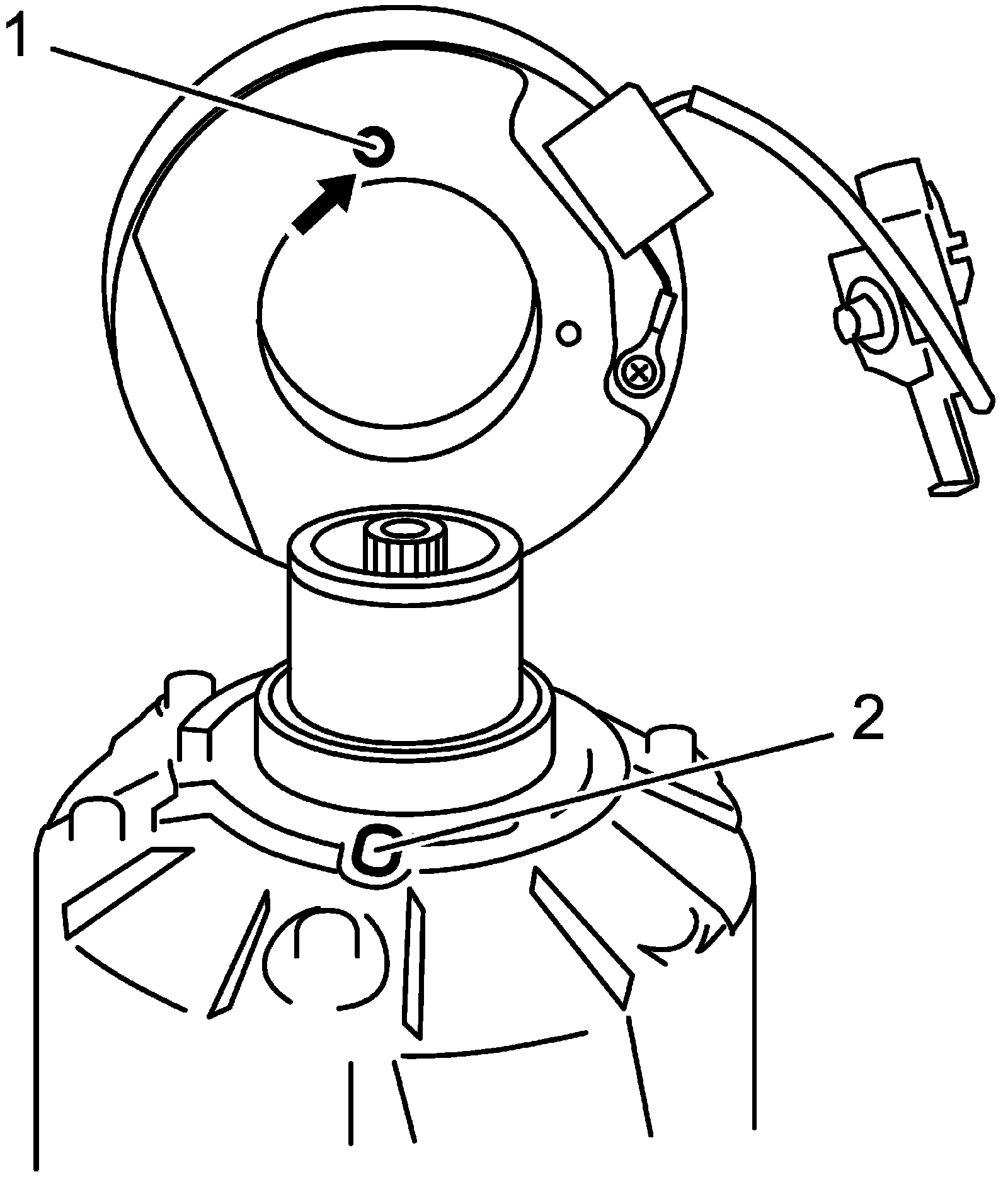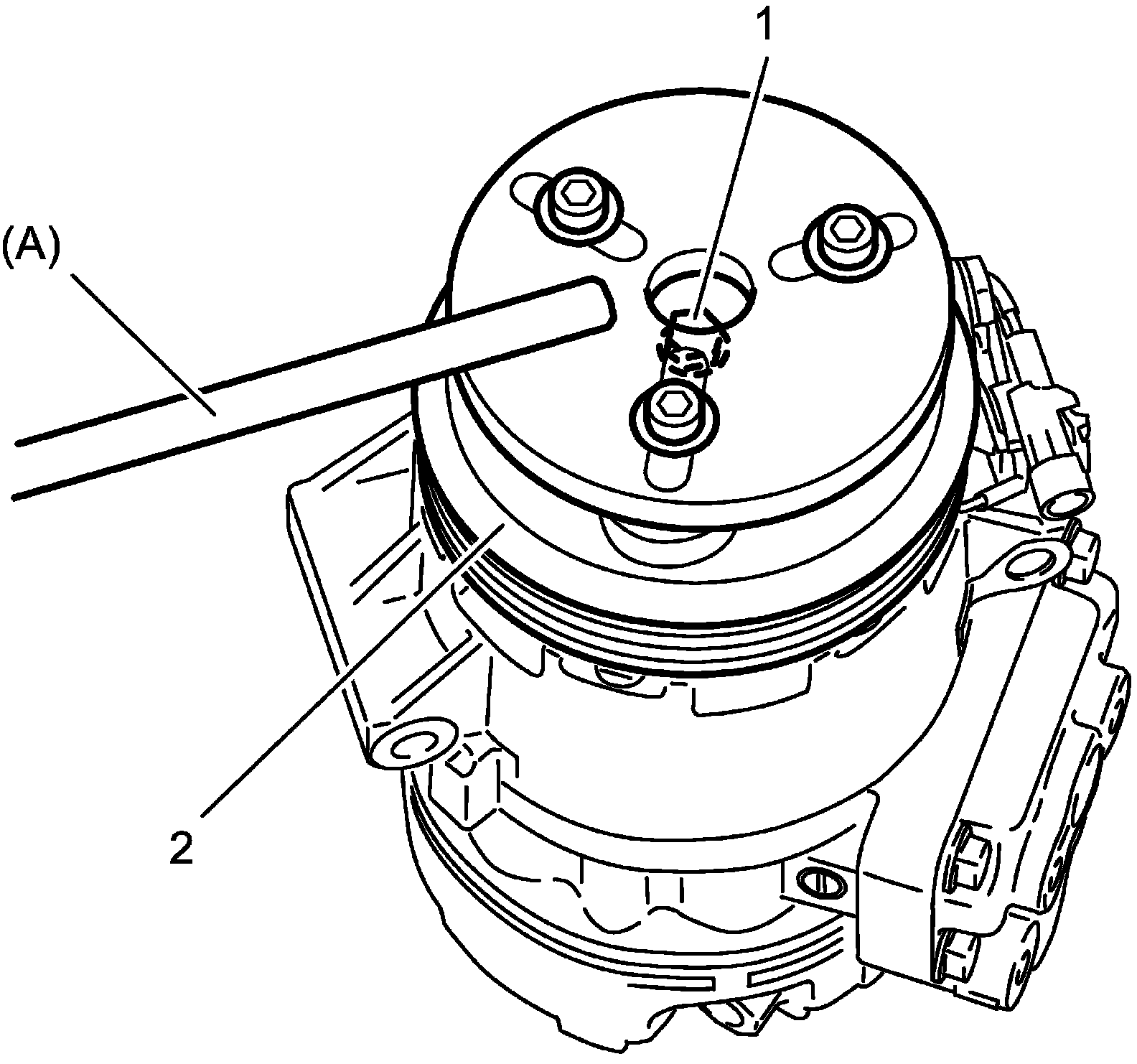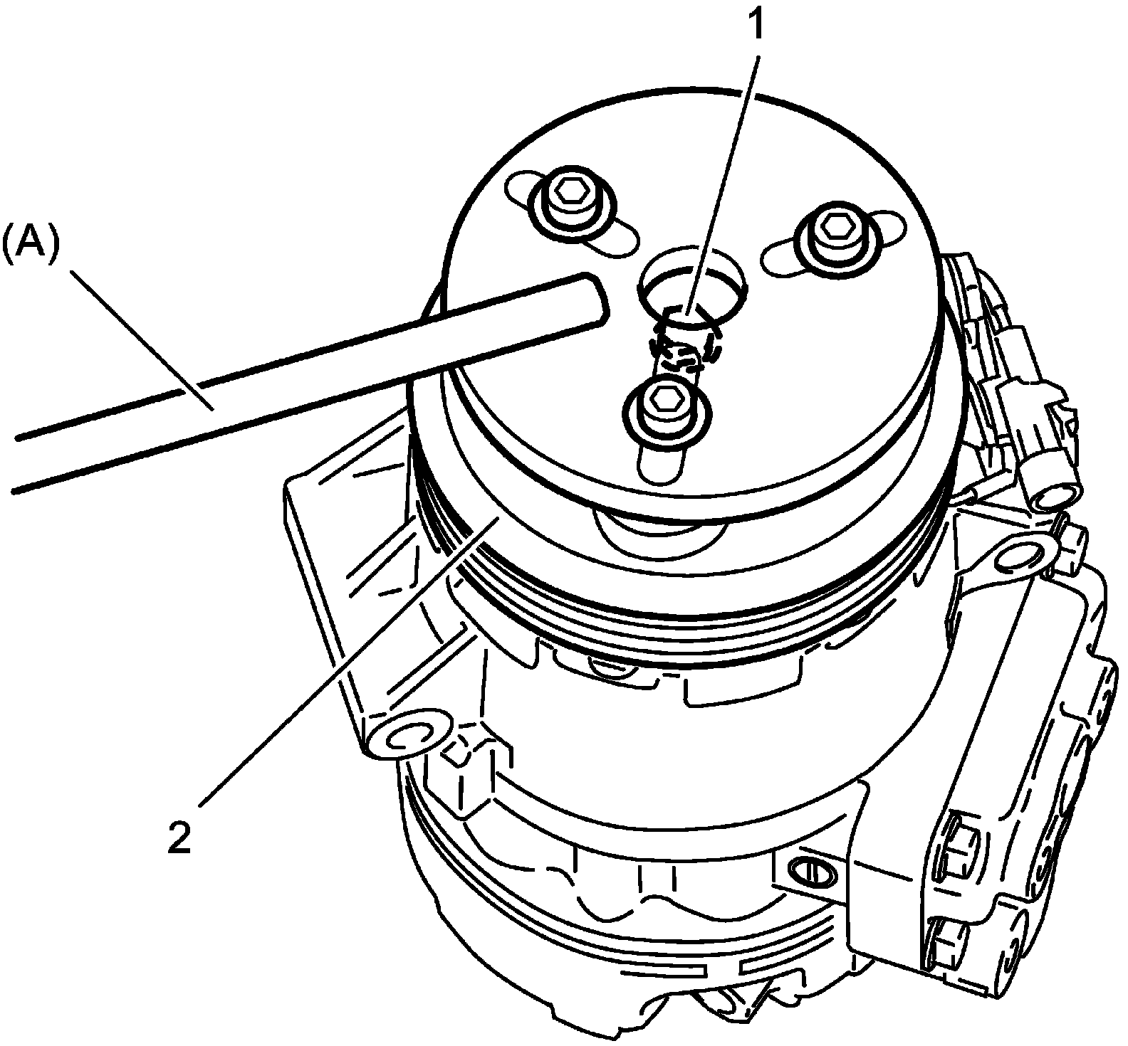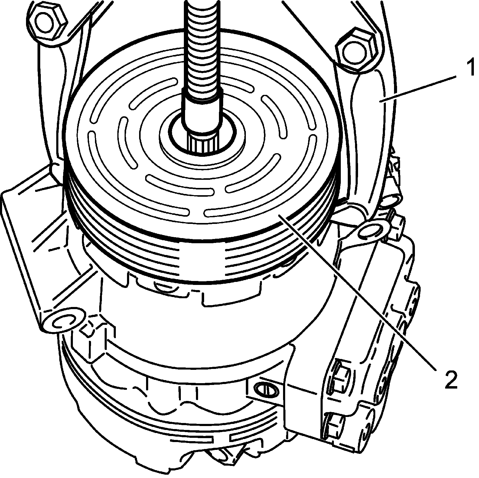 NOTE: Protrusion (1) on underside of magnet clutch coil and hole (2) on compressor body assembly must match to stop movement of magnet clutch coil and to locate lead wire correctly.