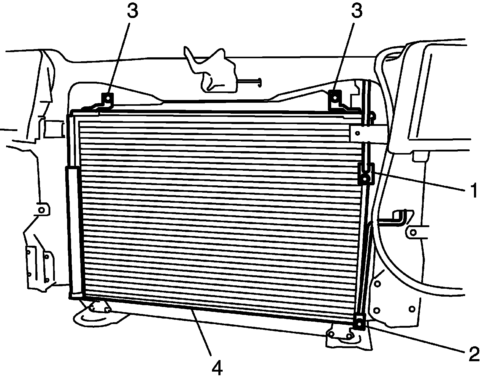 6. Remove condenser assembly mounting bolts (3), and then remove condenser assembly.