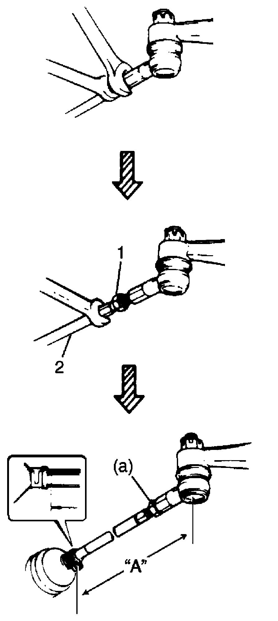 2) Rotate right and left tie-rods (2) by the same amount to align toe to specification. In this adjustment, the lengths "A" of both right and left tie-rod should be equal.