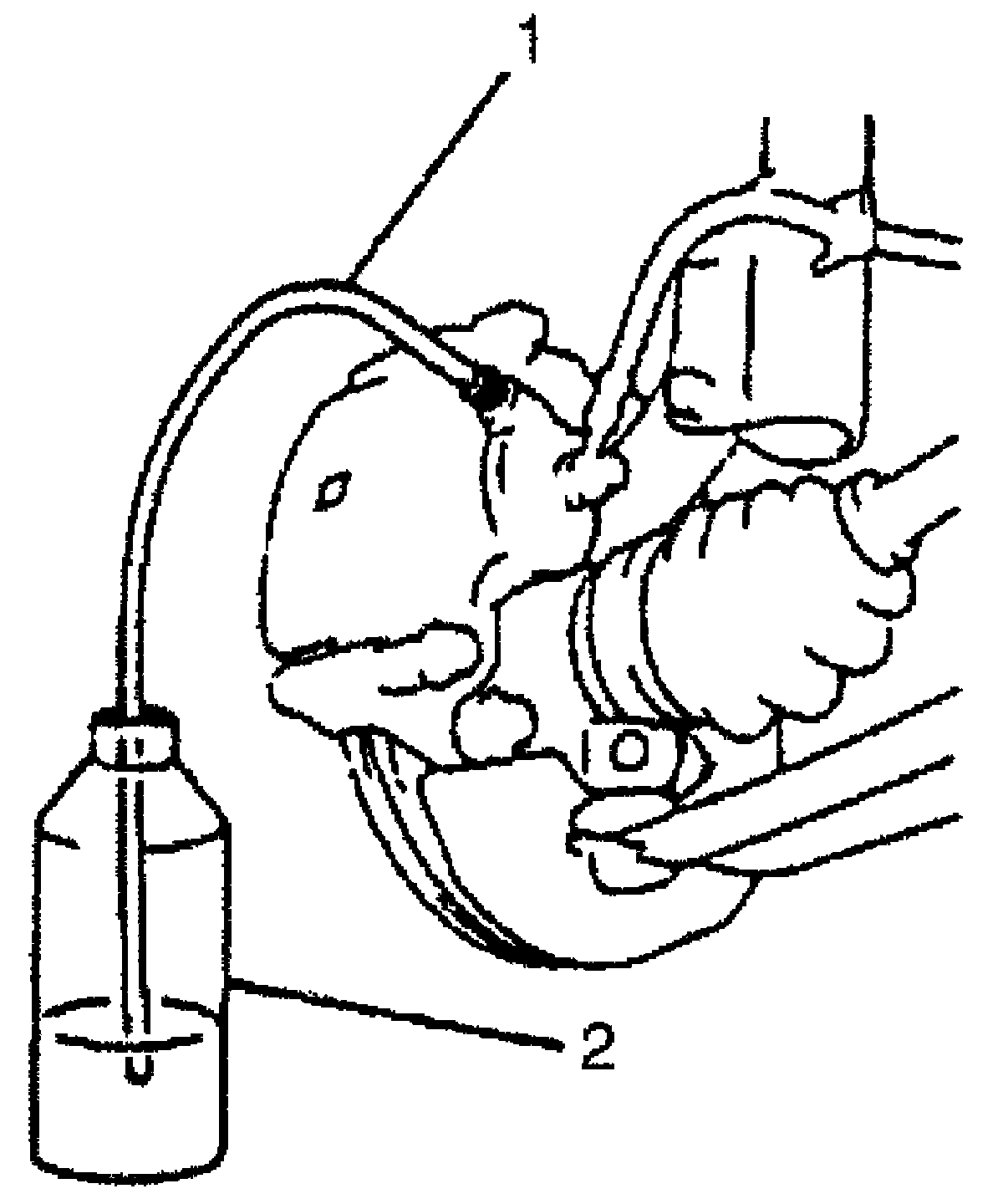 Attach a vinyl tube (1) to bleeder plug, and insert the other end into container (2).
