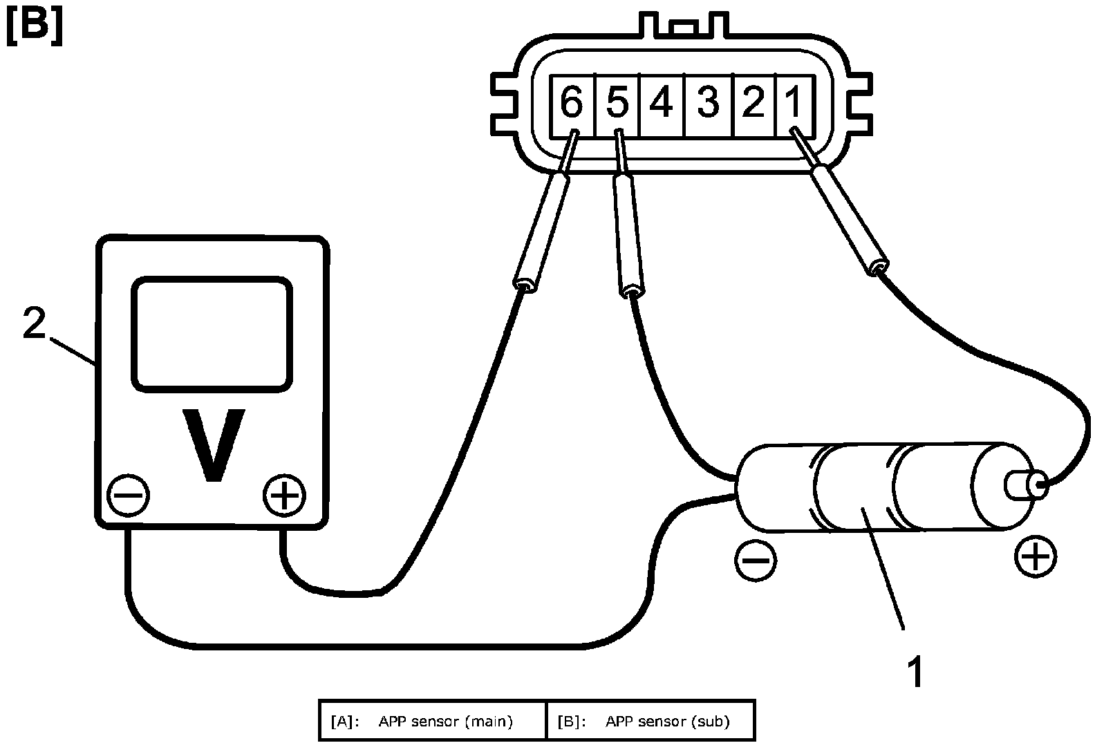 b. Connect voltmeter (2) and batteries to APP sensor as shown in figure.