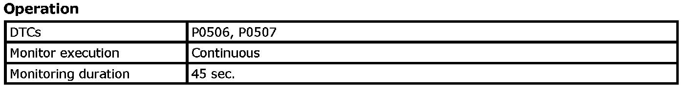 The Idle Air Control (IAC) is functionally checked throttle valve opening by monitoring the closed loop idle speed comparing with the desired idle rpm. If the idle rpm is higher than the desired idle rpm by 200 rpm or lower than the desired idle rpm by 100 rpm, an IAC malfunction is detected. (P0507, P0506)