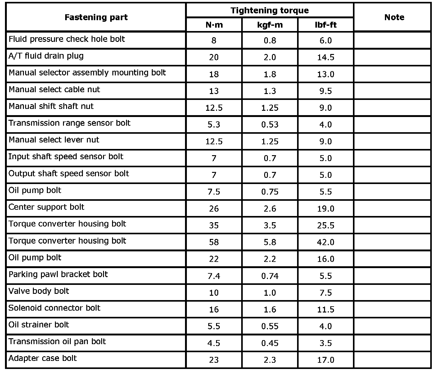 For the tightening torque of fastener not specified in this section, refer to Fastener Information.