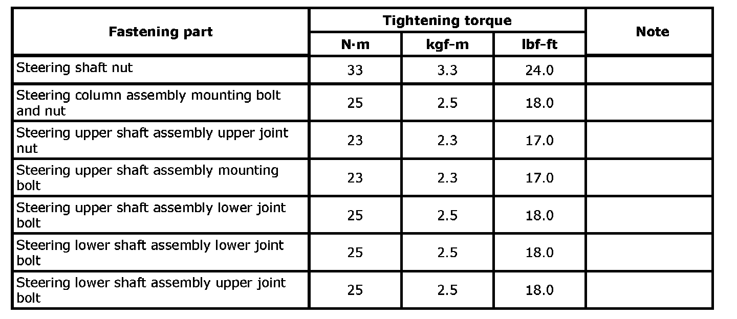 For the tightening torque of fastener not specified in this section, refer to Fastener Information.