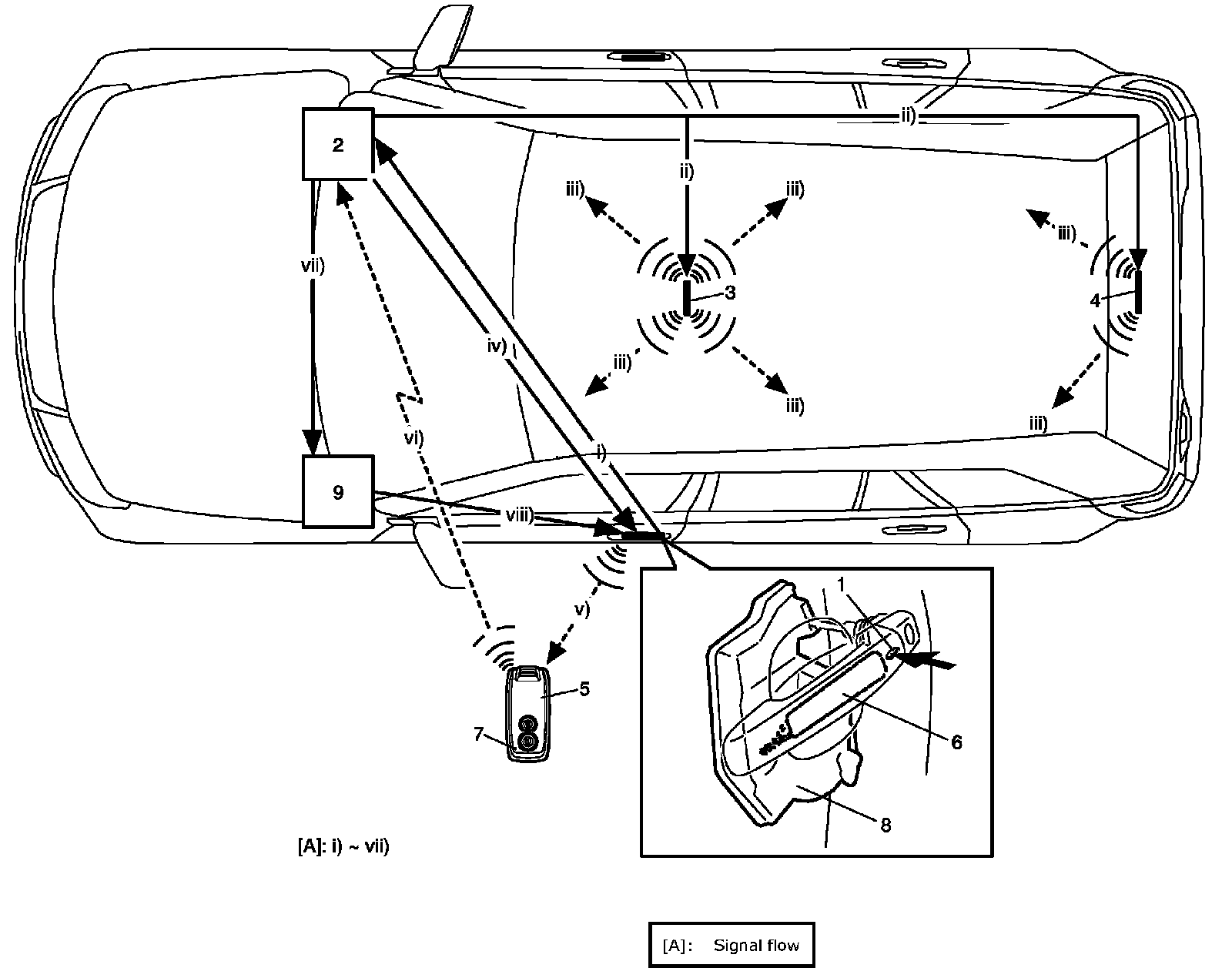Description of Keyless Start System Door Lock FunctionWhen the request switch (1) incorporated in the outside handle of the driver side door, front passenger side door or rear end door is pushed, the keyless start control module (2) activates the center antenna (3) and luggage room antenna (4) to send out the radio wave in the vehicle compartment to check if the remote controller (5) is in the vehicle compartment or not. When the keyless start control module receives no signal from the remote controller (i.e., the remote controller does not exist in the vehicle compartment), it activates the antenna (6) of the door of which the request switch has been pushed to send the request signal out of the compartment. If the remote controller exists within the door lock operation area, it receives the request signal sent from the above said antenna, sends the ID code of the remote controller and the request signal to the keyless start control module and at the same time, it makes the operation indicator light (7) of the remote controller light up. Lighting of the operation indicator light indicates that the remote controller sent the ID code and the request signal.