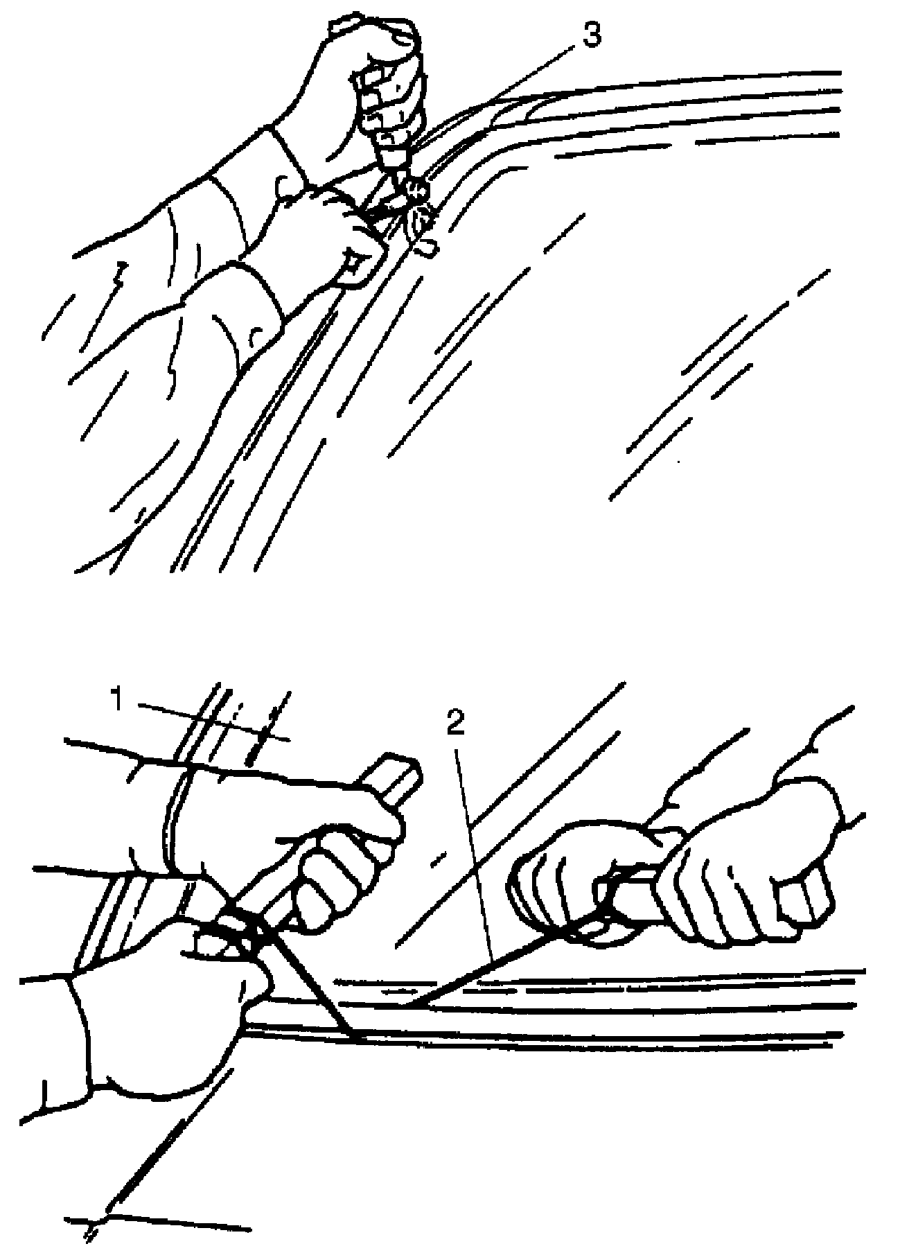 6. Cut adhesive all around rear quarter window (1) with piano string (2). When using tool, windshield knife (3), to cut adhesive, be careful not to cause damage to windshield. Use wire to cut adhesive along lower part of windshield.