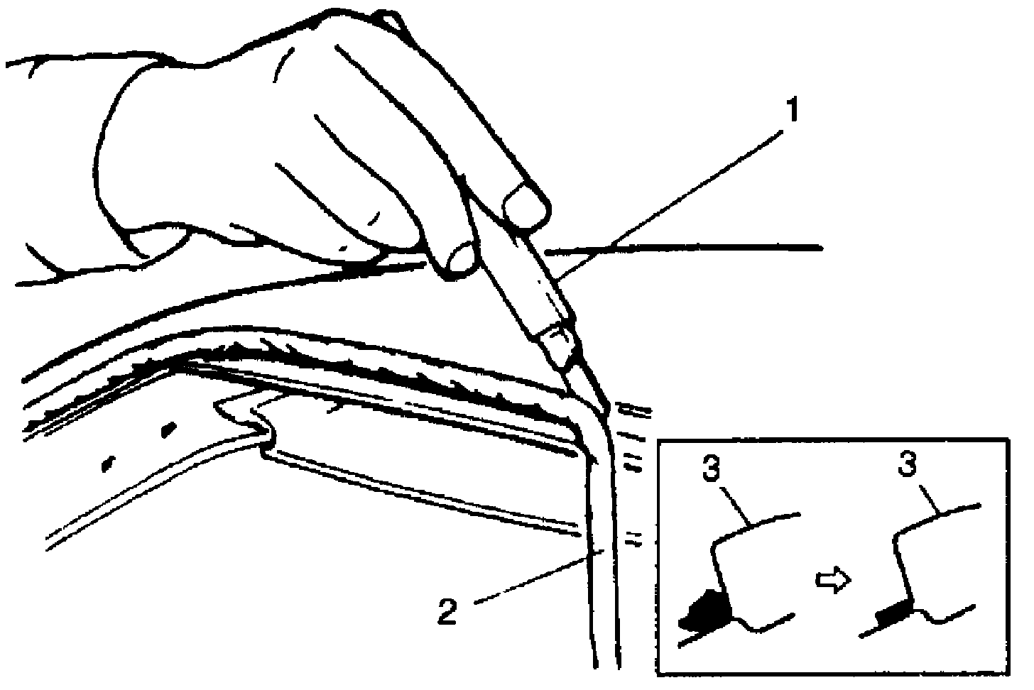 7. Using knife (1), smoothen adhesive (2) remaining on body side (3) so that it is 1 - 2 mm (0.039 - 0.078 in.) thick all around.