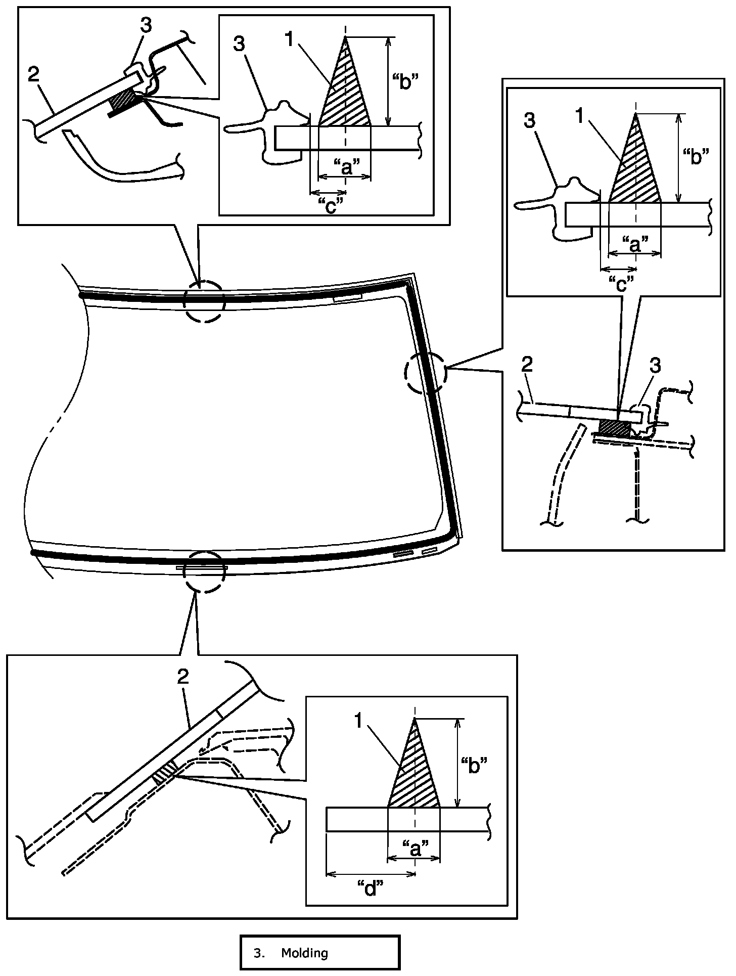 11. Using knife (1), smoothen adhesive (2) remaining on body side (3) so that it is 1 - 2 mm (0.039 - 0.078 in.) thick all around.