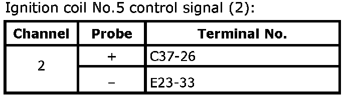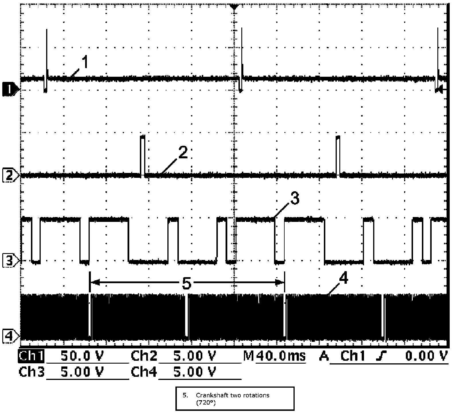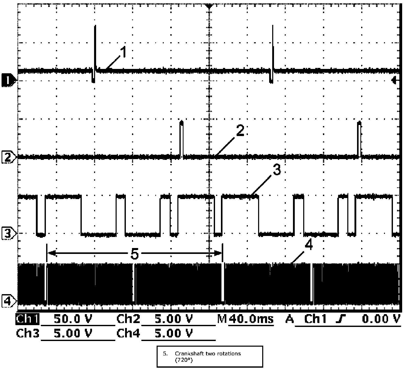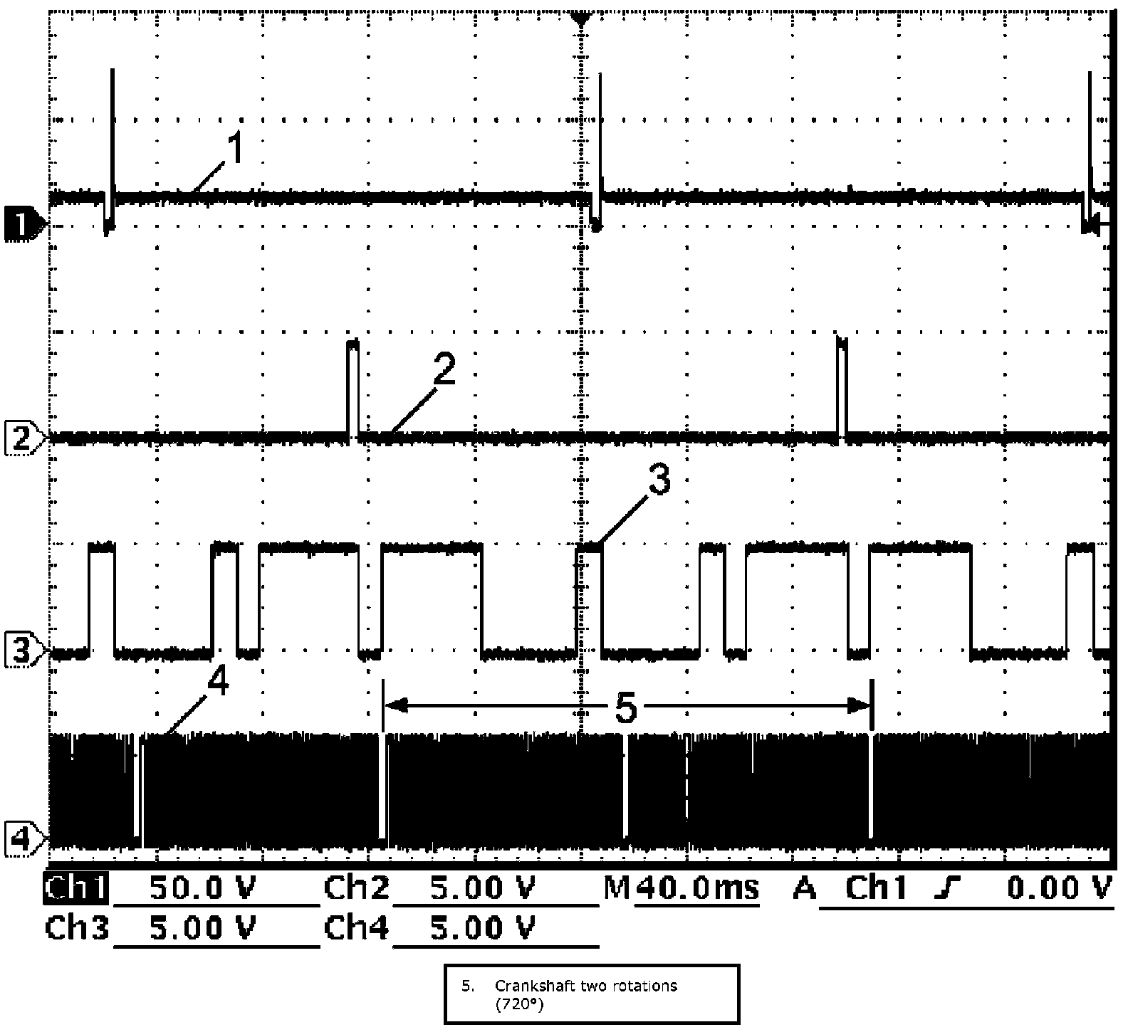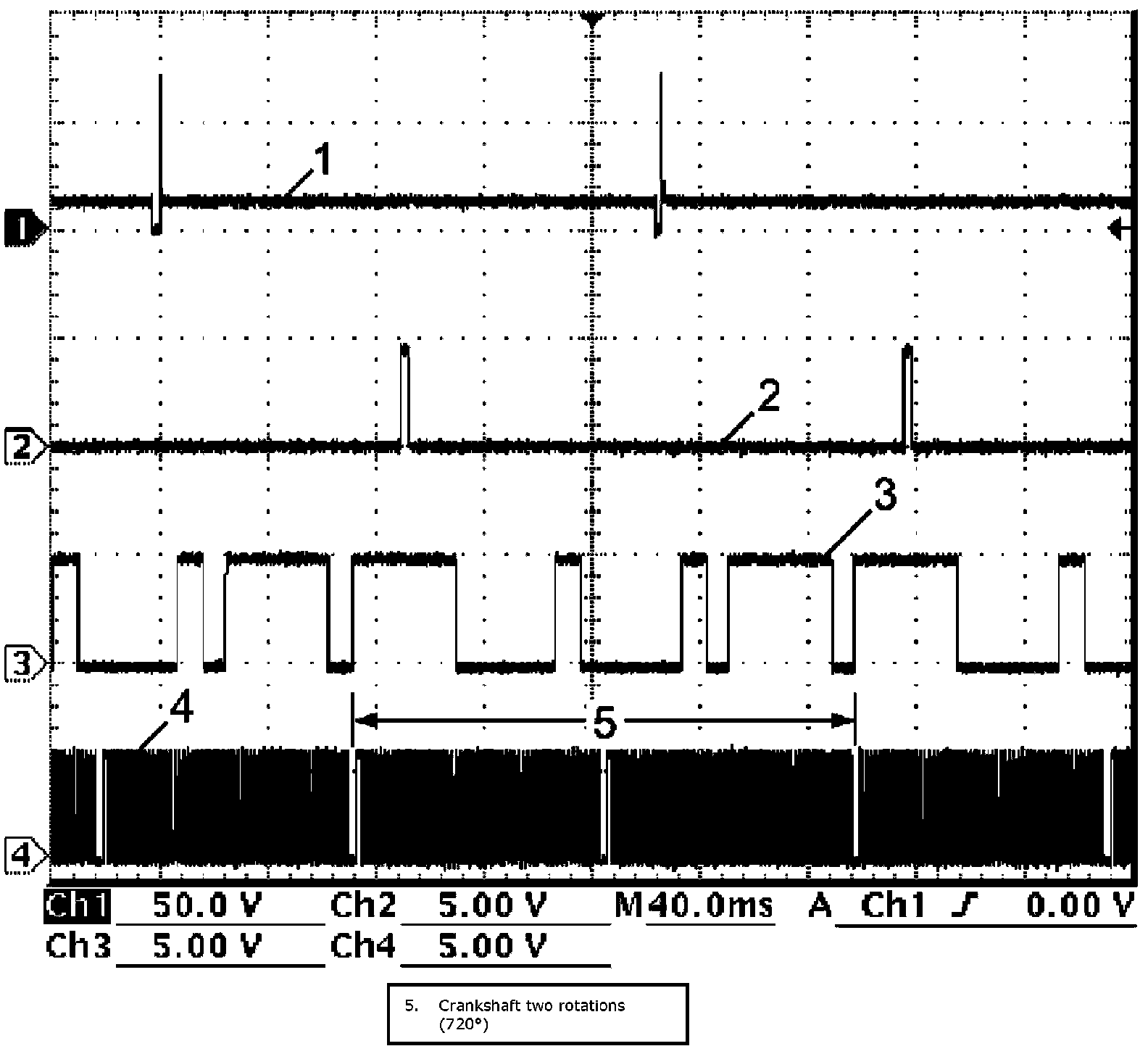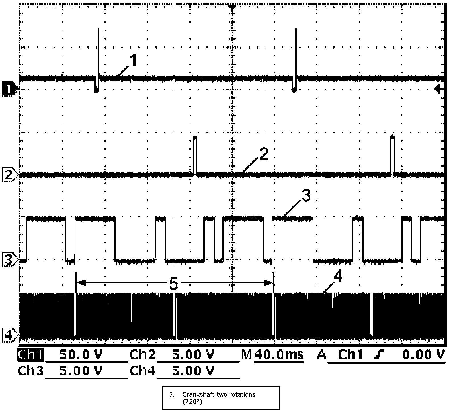 Fuel injector No.5 control signal, ignition coil No.5 control signal, CMP sensor (bank 1 / intake side) signal and CKP sensor signal