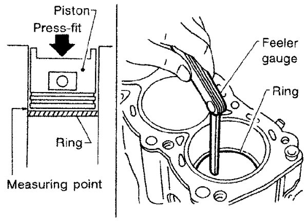 - Lubricate with new engine oil to piston and piston ring, and then insert piston ring until middle of cylinder with piston, and measure piston ring end gap with a feeler gauge.