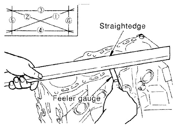 - Measure the distortion on the cylinder block upper face at some different points in six directions with straightedge and feeler gauge.