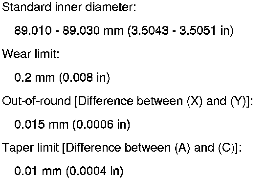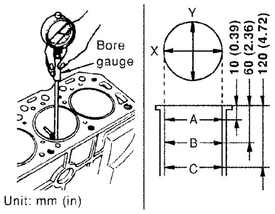 - Using a bore gauge, measure the cylinder bore for wear, out-of-round and taper at six different points on each cylinder. [(X) and (Y) directions at (A), (B) and (C)] [(Y) is in longitudinal direction of the engine].