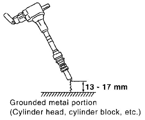 15 Fix ignition coil using a rope etc. with gap of 13 - 17 mm between the edge of the spark plug and grounded metal portion as shown in the figure.