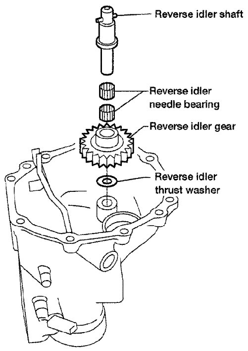 a) Install reverse idler thrust washer, reverse idler gear, reverse idler needle bearings and reverse idler shaft into rear extension.