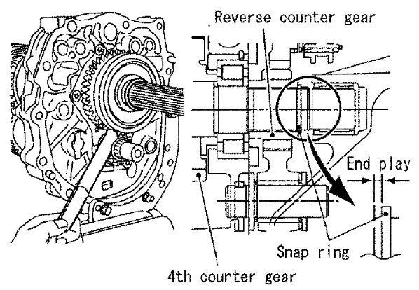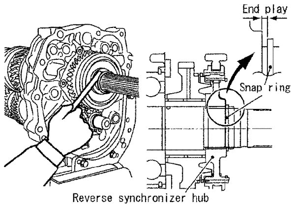 2) Select and install a snap ring so that the end play comes within the standard value. Refer to [Service Data and Specifications] FS6R31A.