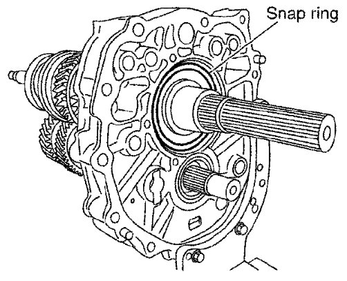 b) Select and install a snap ring to main drive gear bearing so that the end play comes within the standard value. Refer to [Service Data and Specifications] FS6R31A.