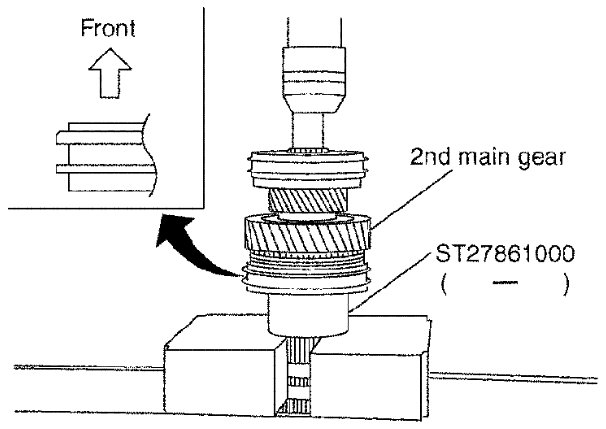 c) Press in 1st-2nd synchronizer hub assembly, 2nd inner baulk ring, 2nd synchronizer cone and 2nd outer baulk ring, 2nd main gear and 2nd needle bearing using Tool.