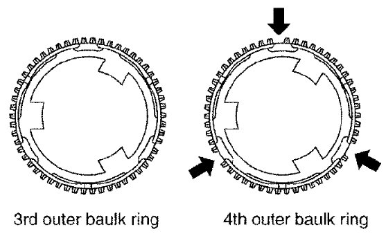 1st outer baulk ring has three spaces that three gear tooth is missing and 2nd outer baulk ring has three spaces that two gear teeth are missing.