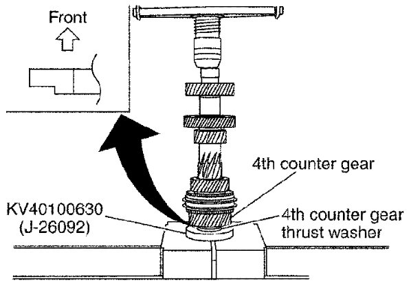 13) Press in 4th counter gear thrust washer, 4th gear bushing, 4th needle bearing, 4th counter gear, 4th outer baulk ring,4th synchronizer cone and 4th inner baulk ring using Tool.
